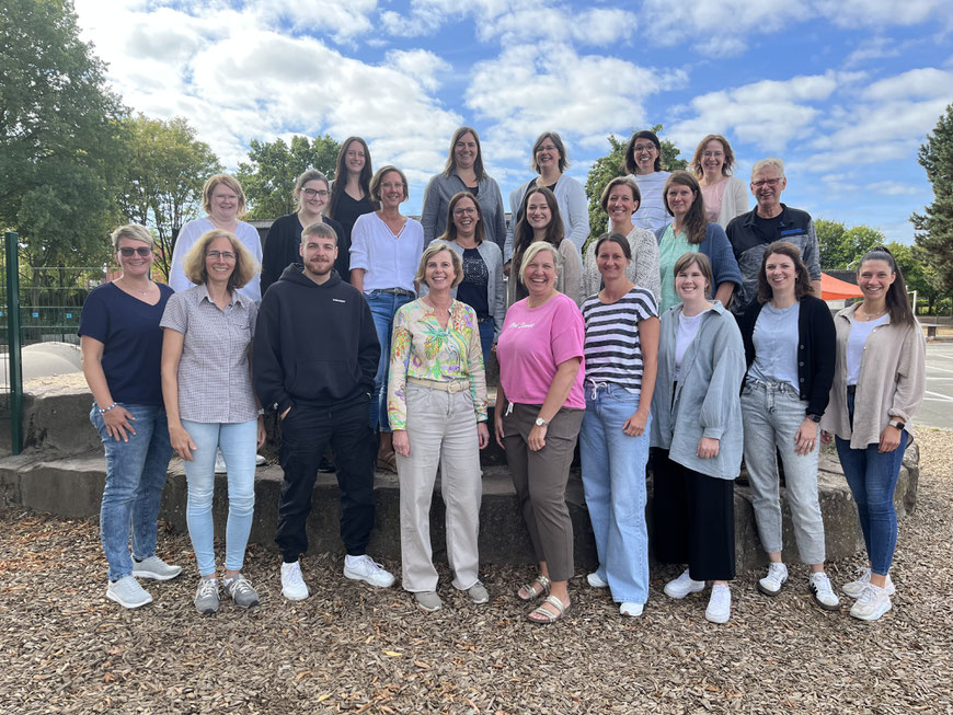 mittlere Reihe v.l.n.r.: Frau Stapel (Konrektorin), Frau Brüninghoff, Frau Meyer-Richter, Frau Hegemann (Rektorin), Frau Schynoll (Lehramtsanwärterin), Frau Landerbarthold, Frau Schmitz, Herr Hagedorn (Hausmeister)