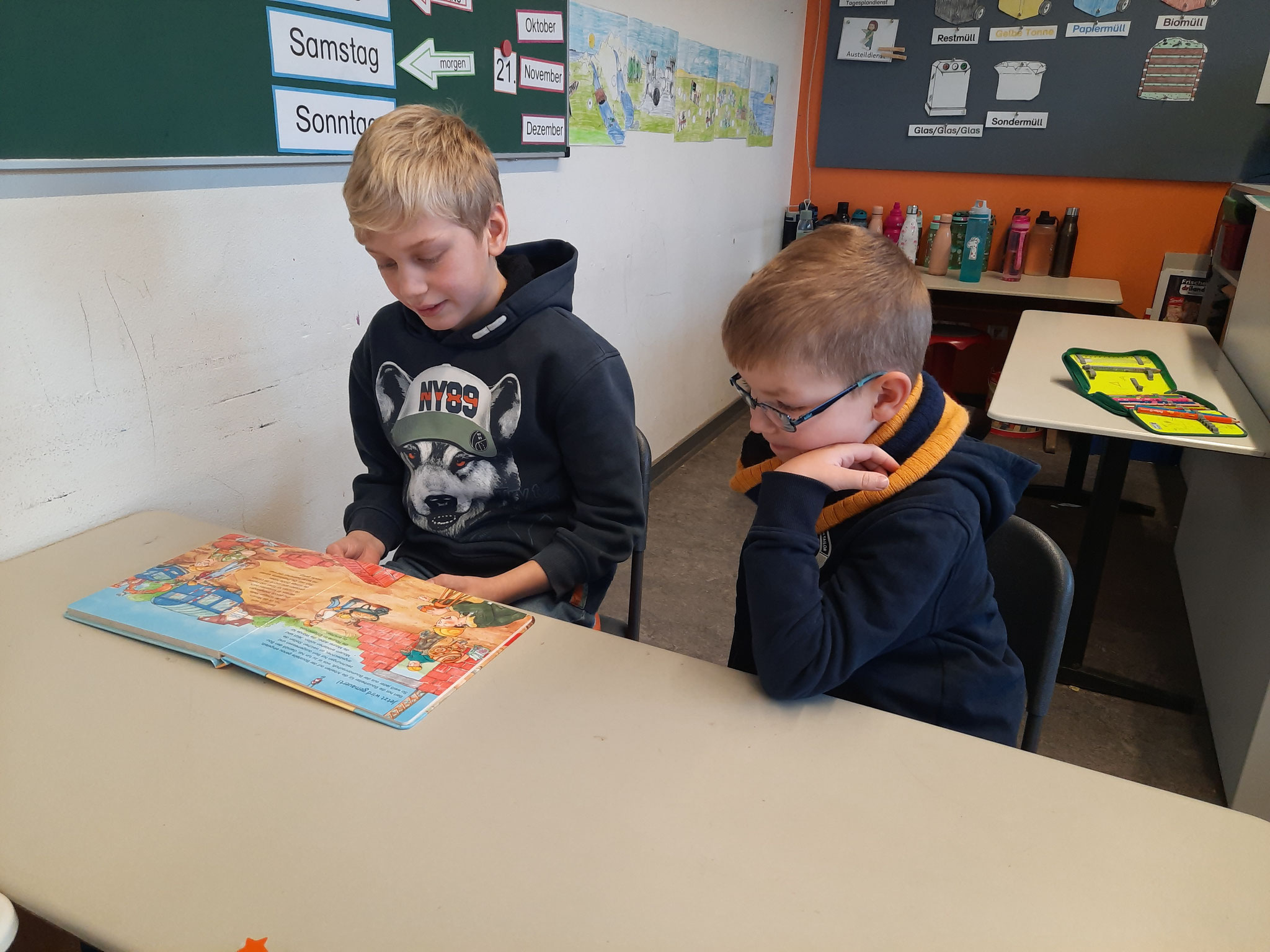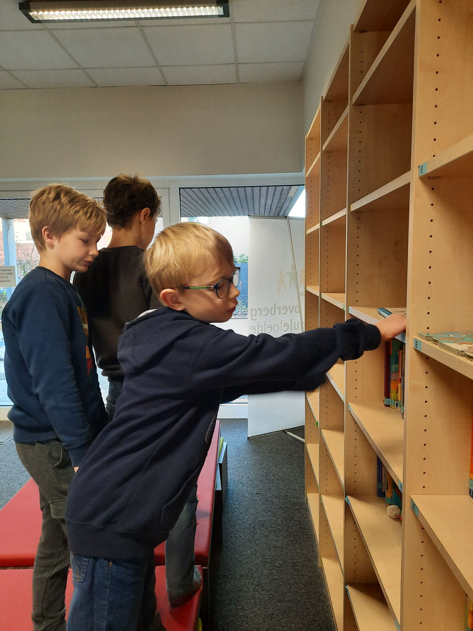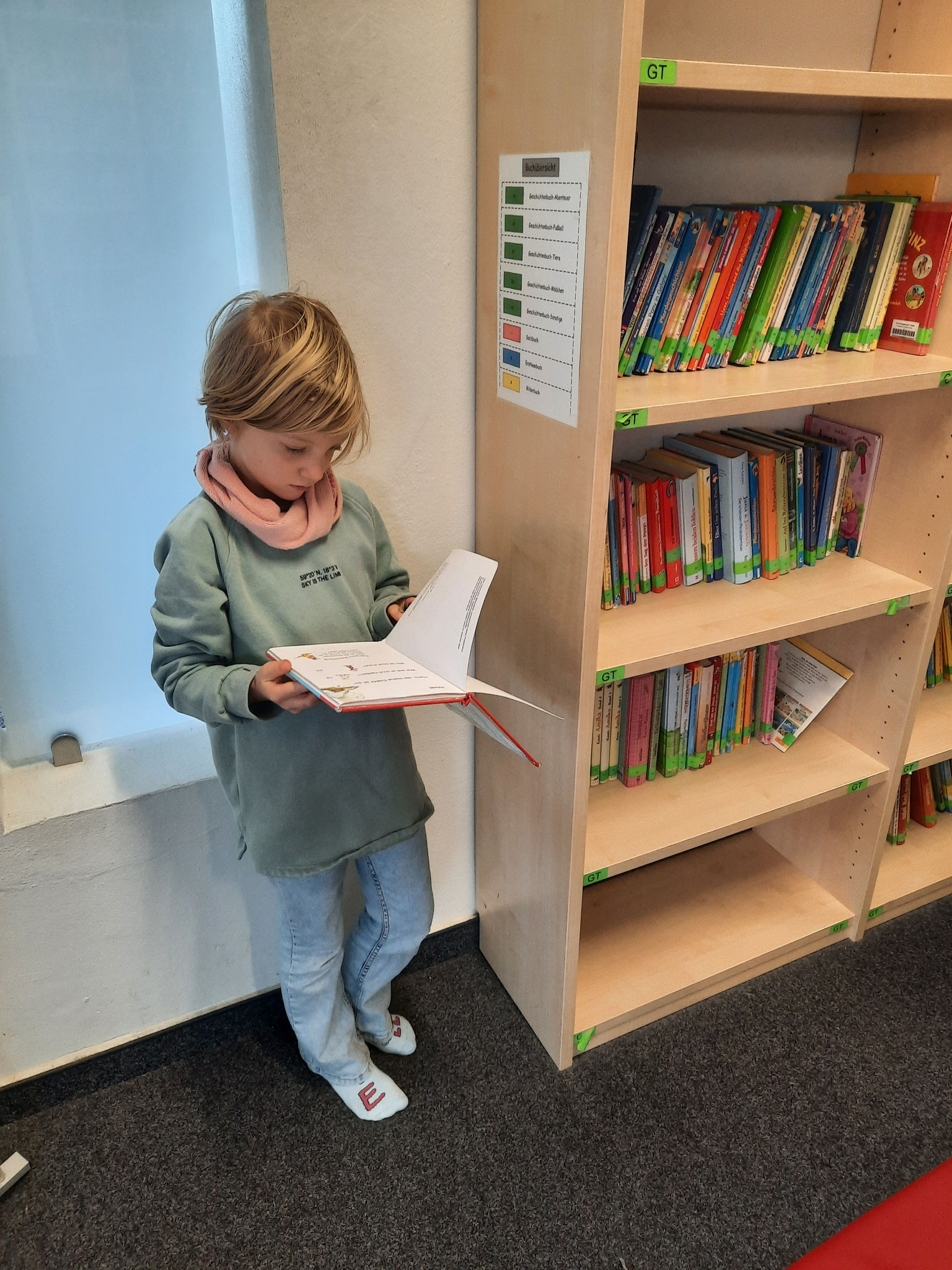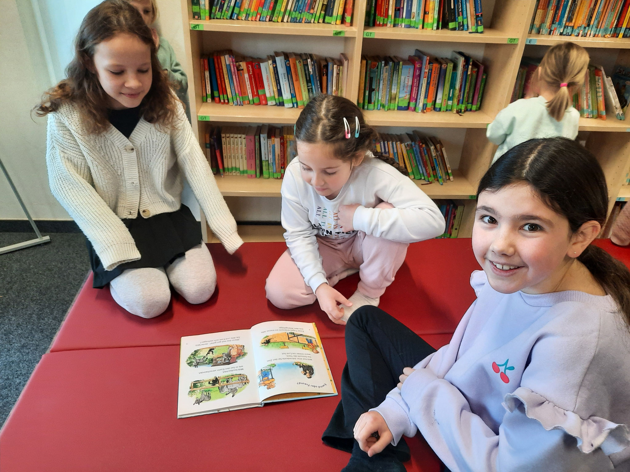 Anschließend wird es für uns Erstklässler besonders spannend. Wir gehen das erste Mal in unsere Schülerbücherei. Dort gibt es eine Menge zu sehen und es ist gar nicht so einfach, bei den vielen Büchern den Überblick zu bewahren. Aber unsere Paten helfen uns, ein passendes Buch zu finden, das sie uns dann vorlesen. Vom Bilderbuch bis zum Sachbuch ist alles dabei. Interessiert hören wir zu und müssen bei dem ein oder anderen Buch auch schon mal lachen.