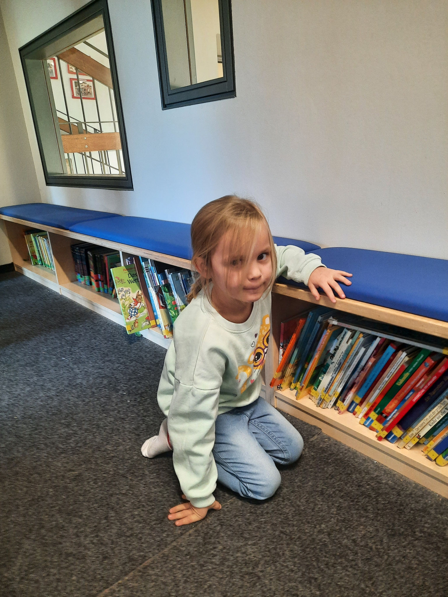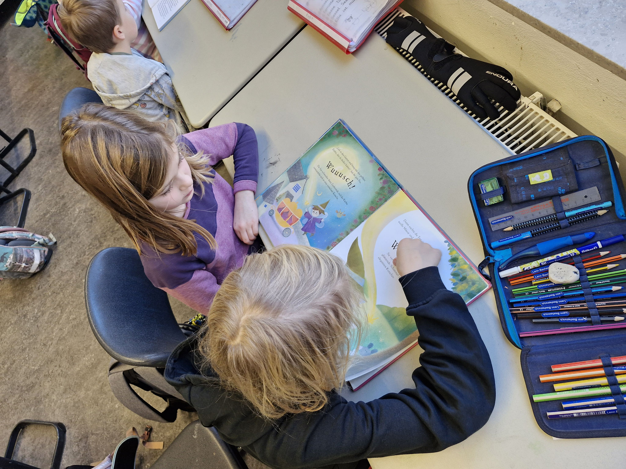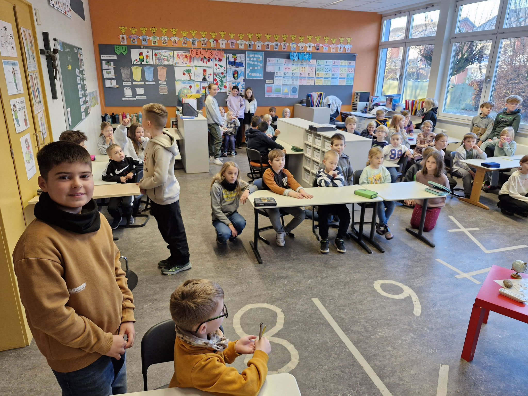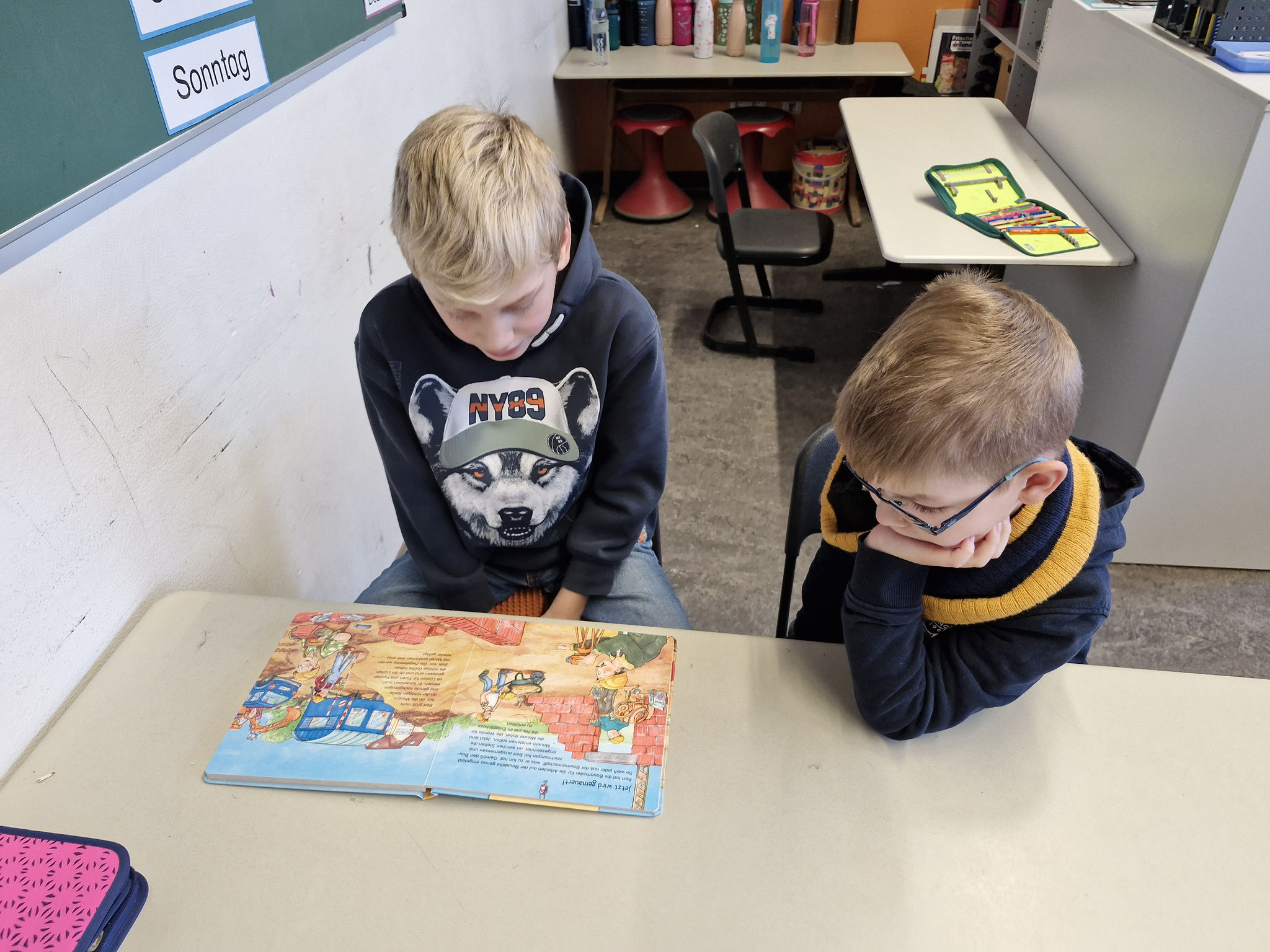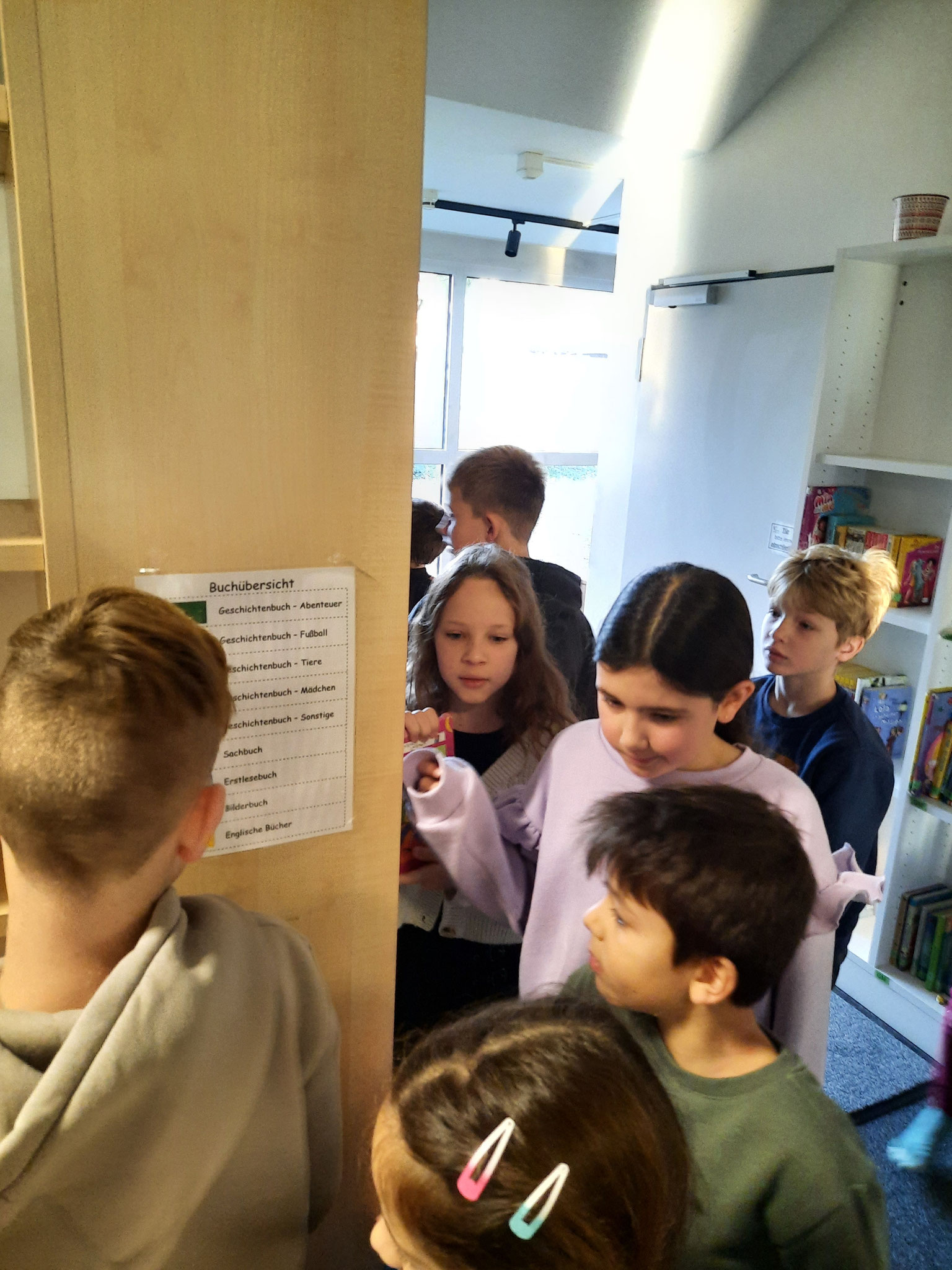 Anschließend wird es für uns Erstklässler besonders spannend. Wir gehen das erste Mal in unsere Schülerbücherei. Dort gibt es eine Menge zu sehen und es ist gar nicht so einfach, bei den vielen Büchern den Überblick zu bewahren. Aber unsere Paten helfen uns, ein passendes Buch zu finden, das sie uns dann vorlesen. Vom Bilderbuch bis zum Sachbuch ist alles dabei. Interessiert hören wir zu und müssen bei dem ein oder anderen Buch auch schon mal lachen.