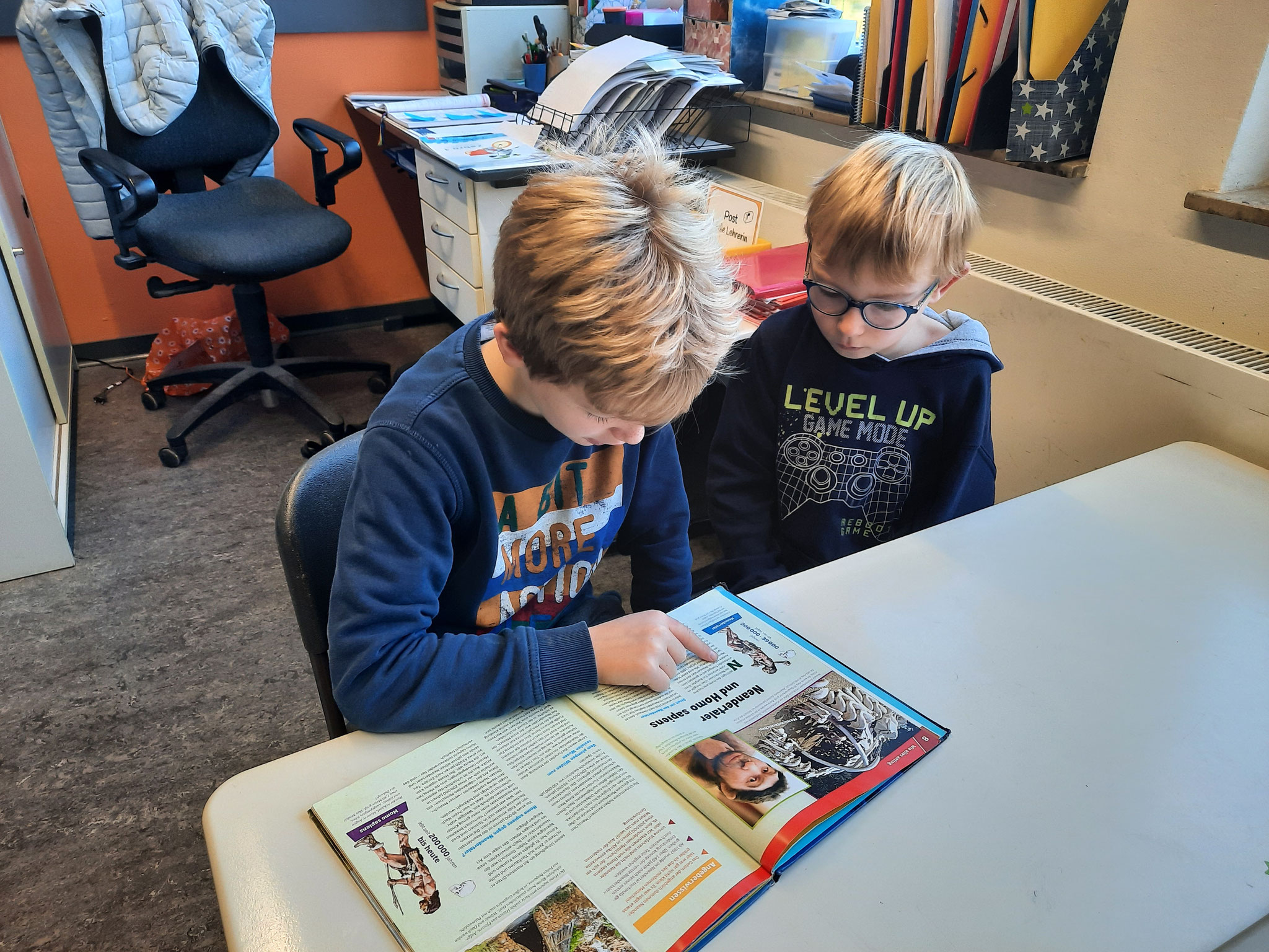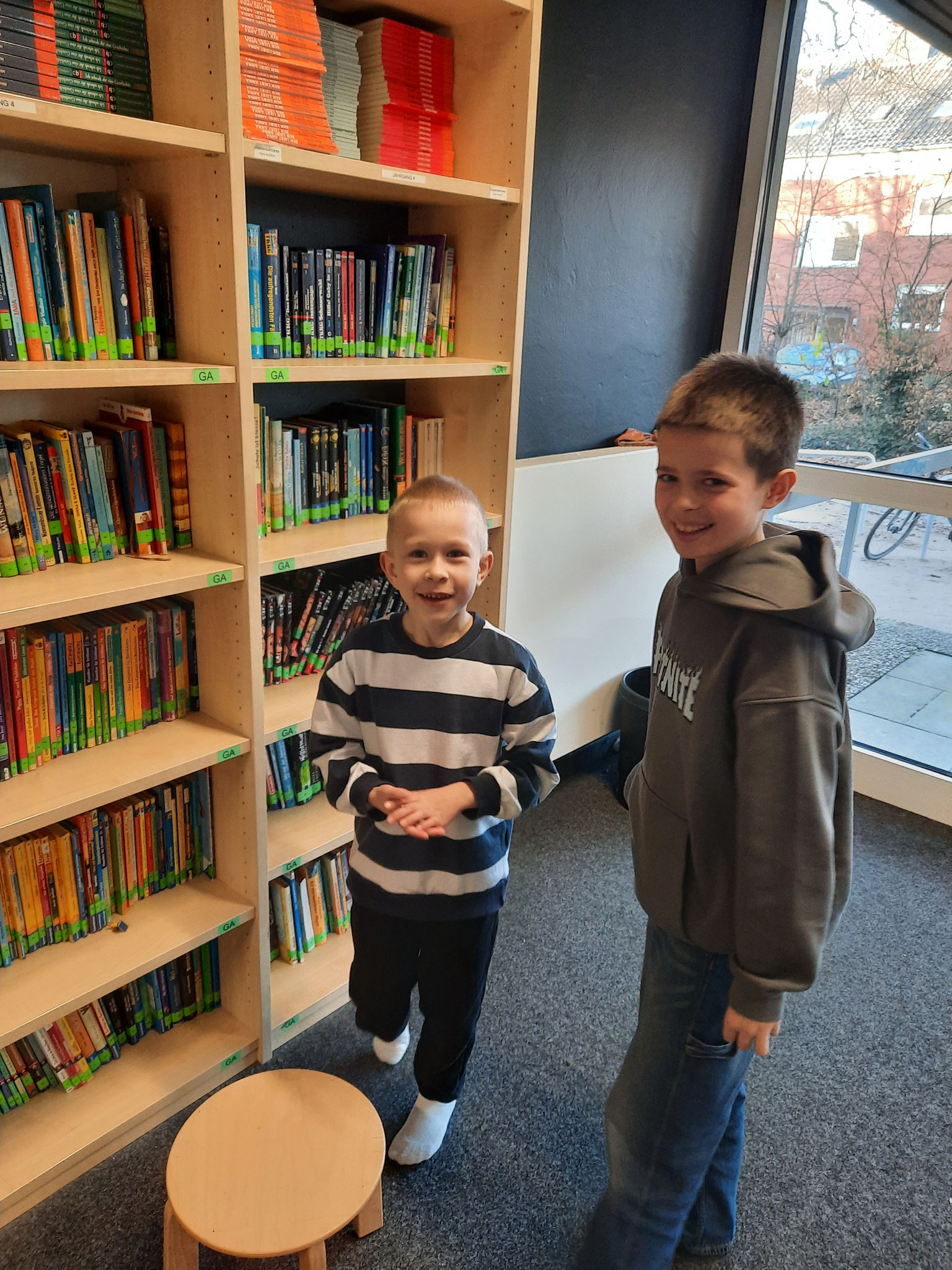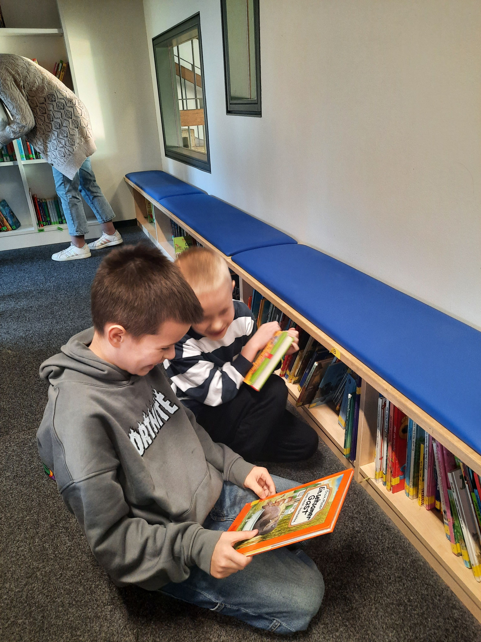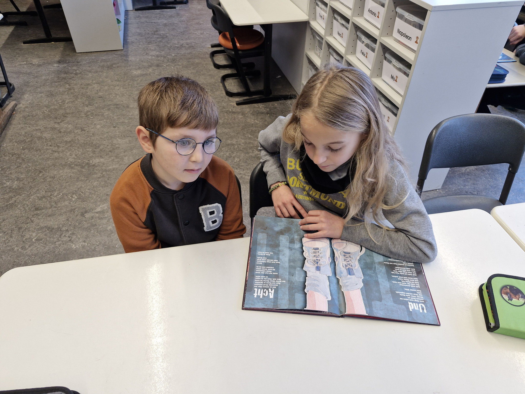 Anschließend wird es für uns Erstklässler besonders spannend. Wir gehen das erste Mal in unsere Schülerbücherei. Dort gibt es eine Menge zu sehen und es ist gar nicht so einfach, bei den vielen Büchern den Überblick zu bewahren. Aber unsere Paten helfen uns, ein passendes Buch zu finden, das sie uns dann vorlesen. Vom Bilderbuch bis zum Sachbuch ist alles dabei. Interessiert hören wir zu und müssen bei dem ein oder anderen Buch auch schon mal lachen.