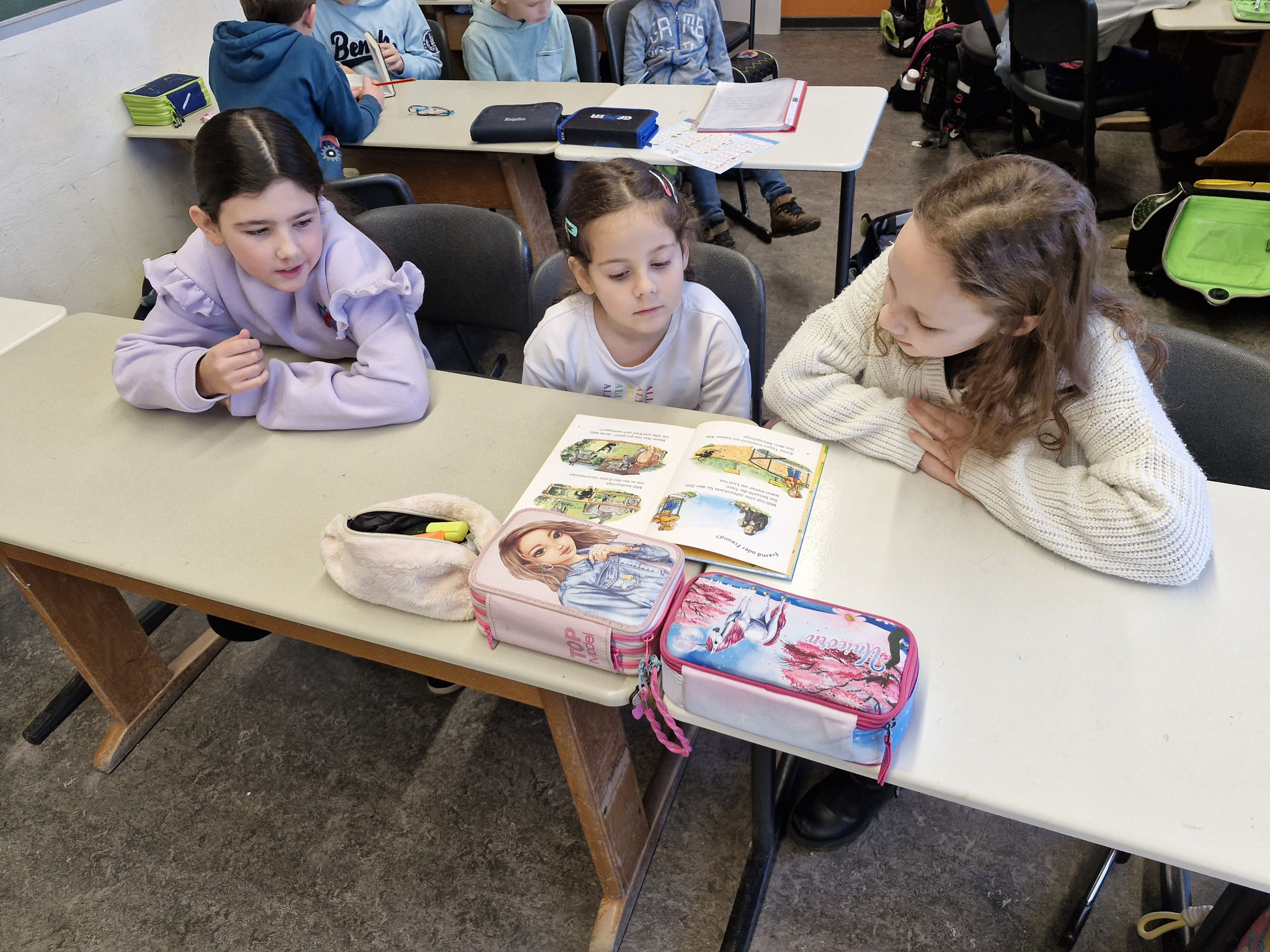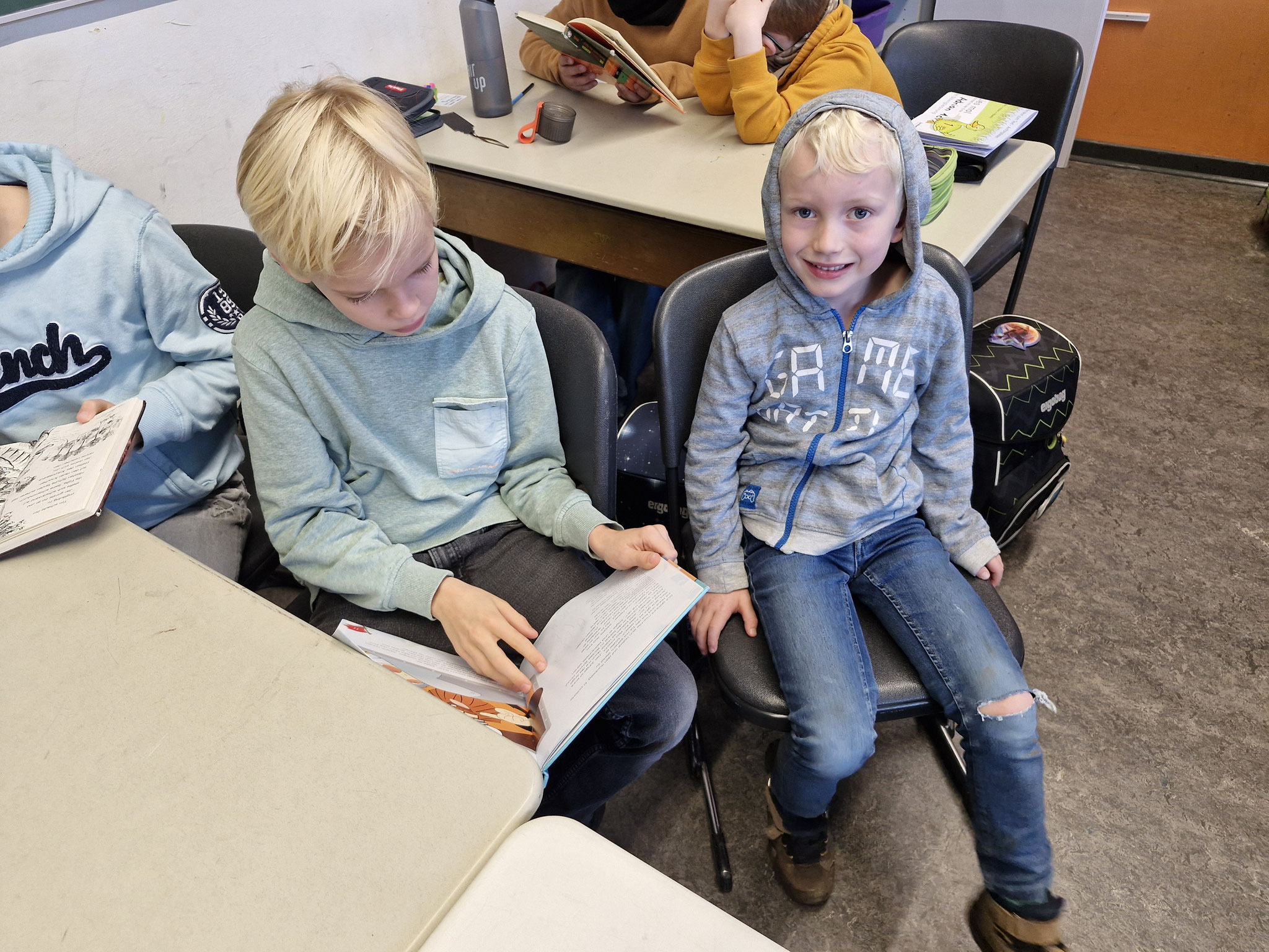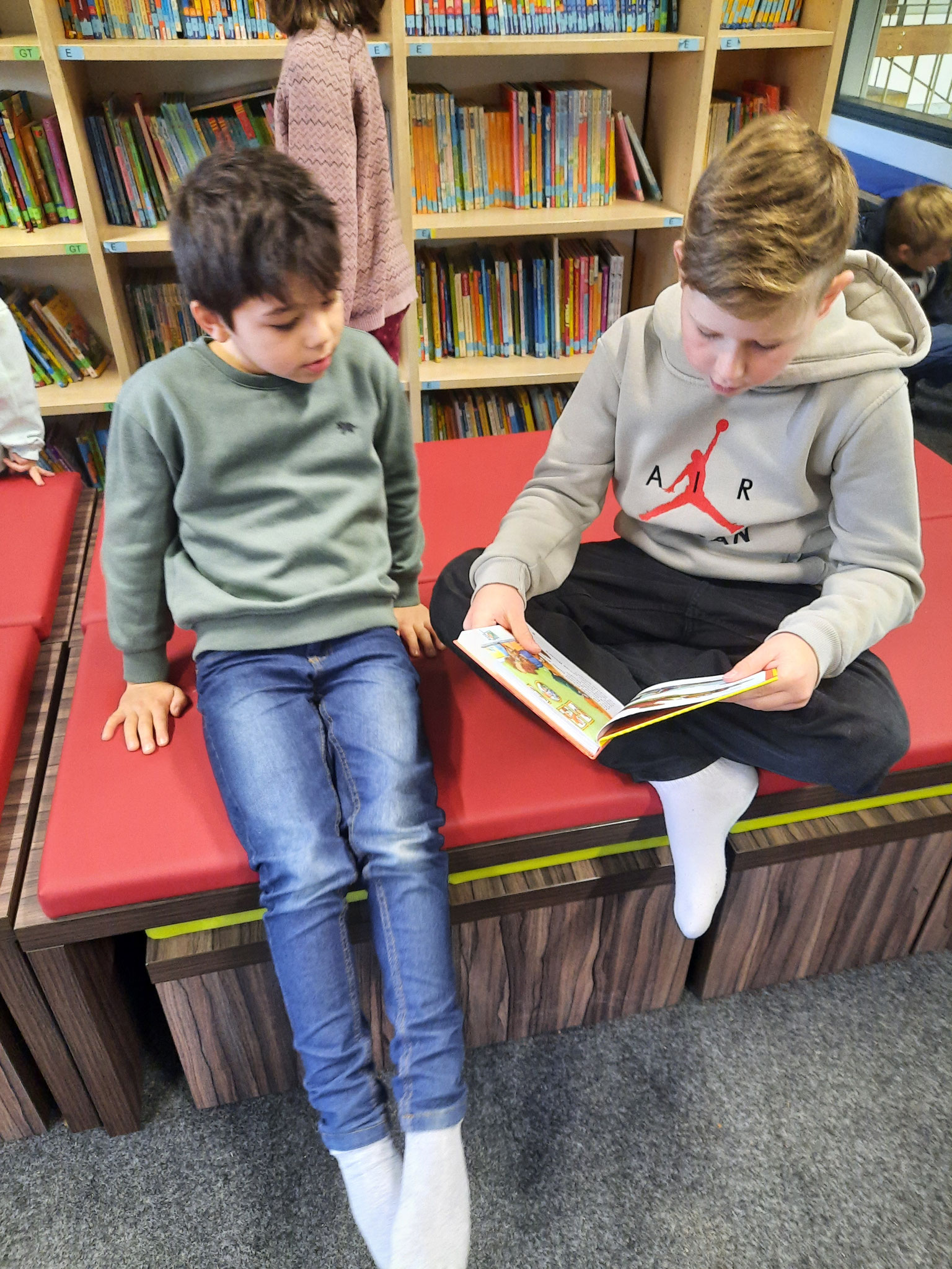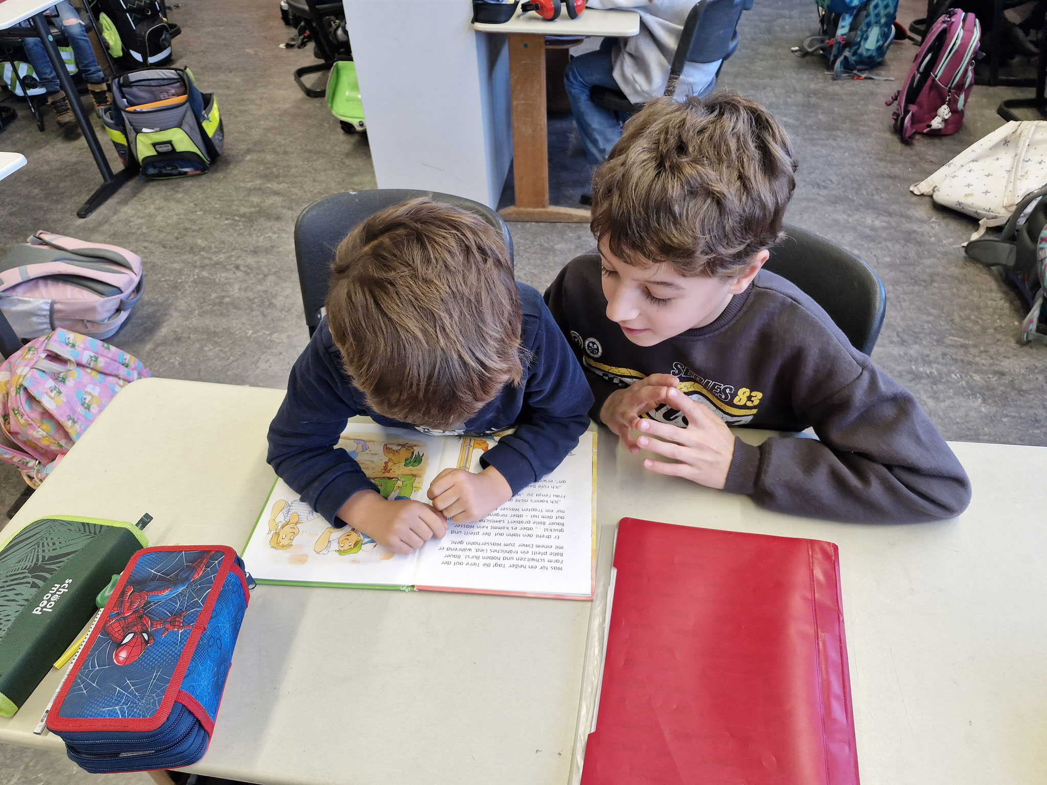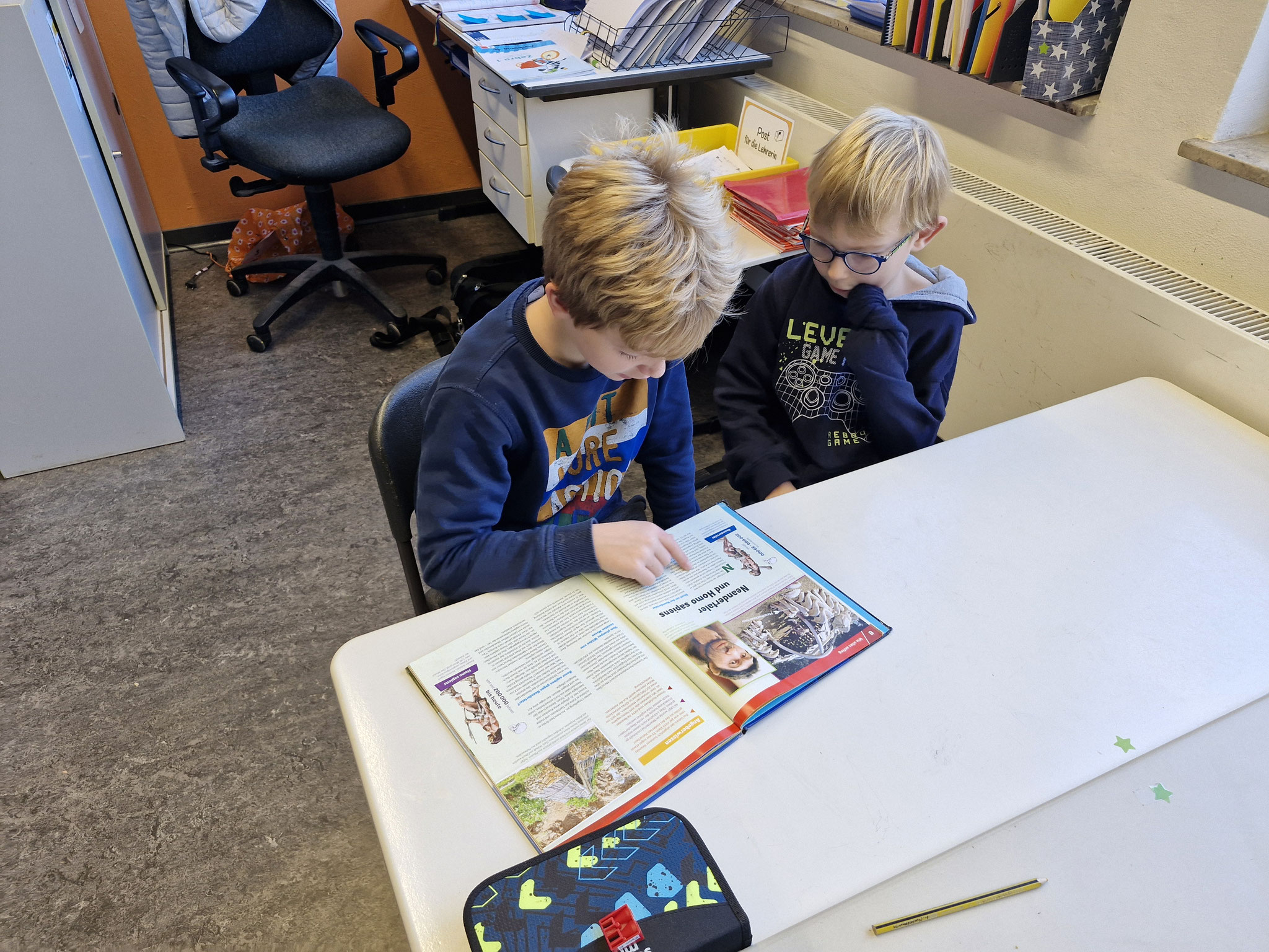 Anschließend wird es für uns Erstklässler besonders spannend. Wir gehen das erste Mal in unsere Schülerbücherei. Dort gibt es eine Menge zu sehen und es ist gar nicht so einfach, bei den vielen Büchern den Überblick zu bewahren. Aber unsere Paten helfen uns, ein passendes Buch zu finden, das sie uns dann vorlesen. Vom Bilderbuch bis zum Sachbuch ist alles dabei. Interessiert hören wir zu und müssen bei dem ein oder anderen Buch auch schon mal lachen.