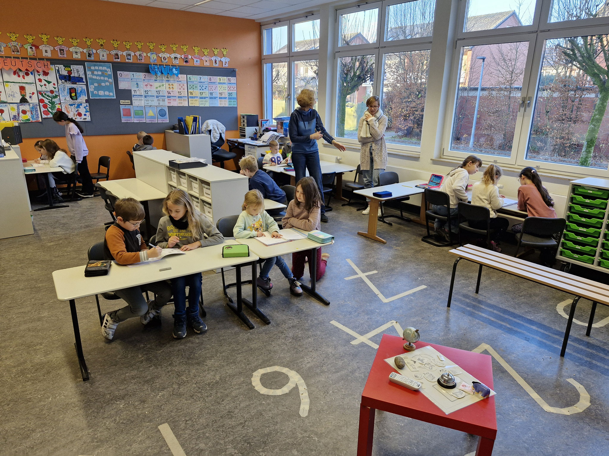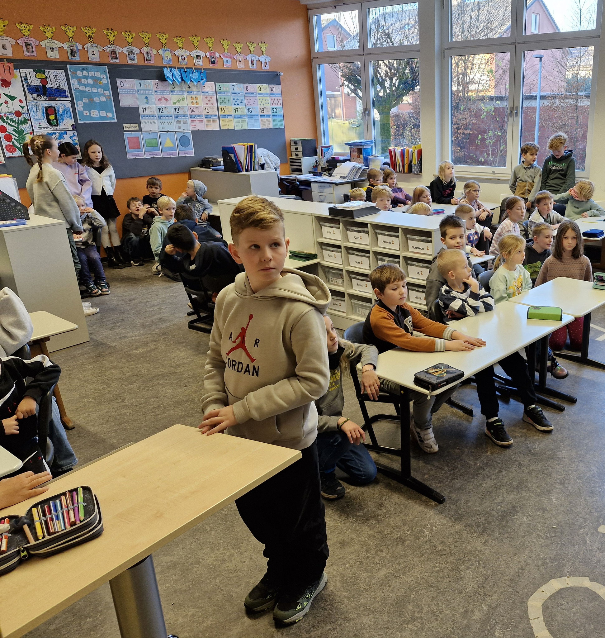 Wir teilten unsere Klasse in zwei Gruppen auf und gingen mit Frau Krewerth und Herrn Stracke durch das angrenzende Wohngebiet. An verschiedenen Stellen übten wir, sicher die Straße zu überqueren. Das war besonders schwierig, wenn parkende Autos uns die Sicht versperrten oder wir an Kreuzungen mit vielen Straßen standen. Aber auch hier schafften es alle Kinder über die Fahrbahn. Das machte uns mächtig stolz.