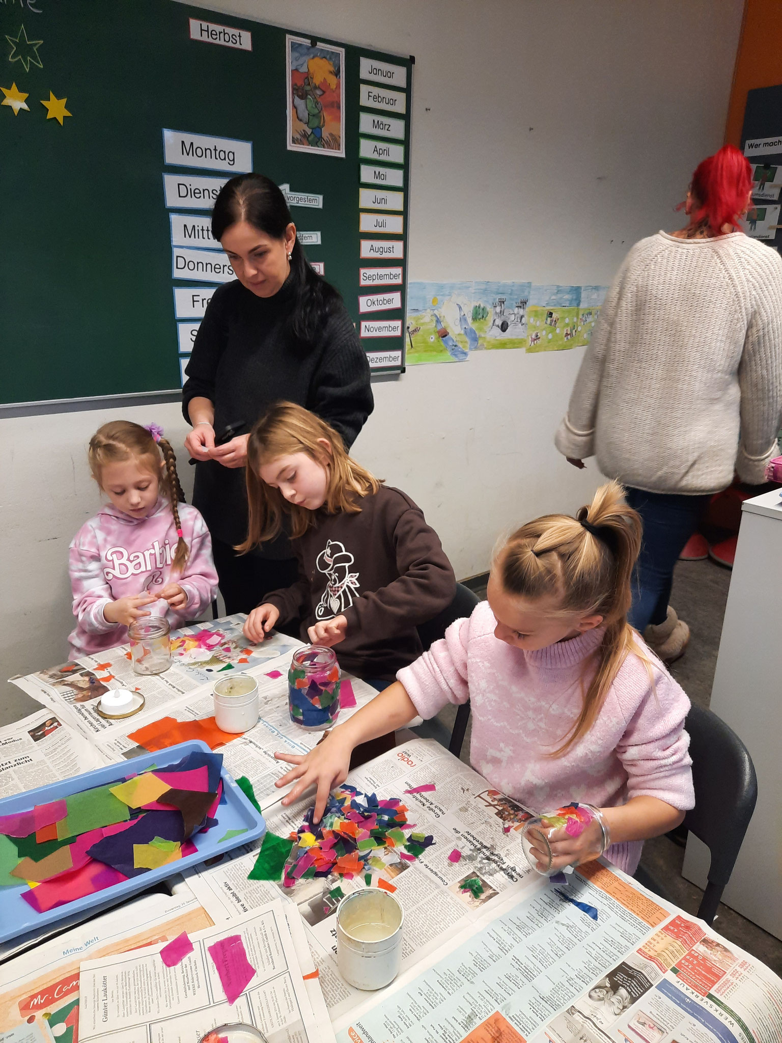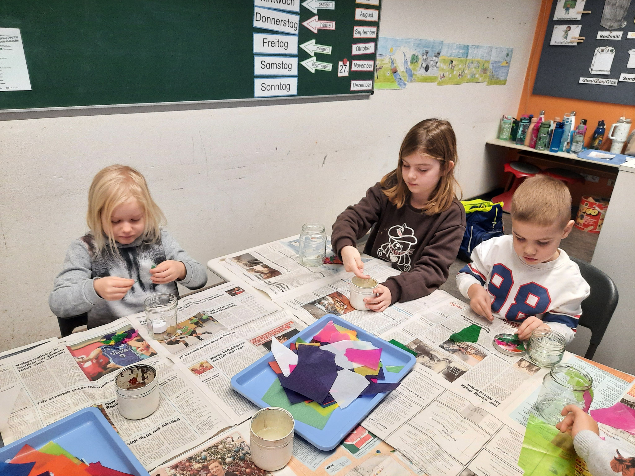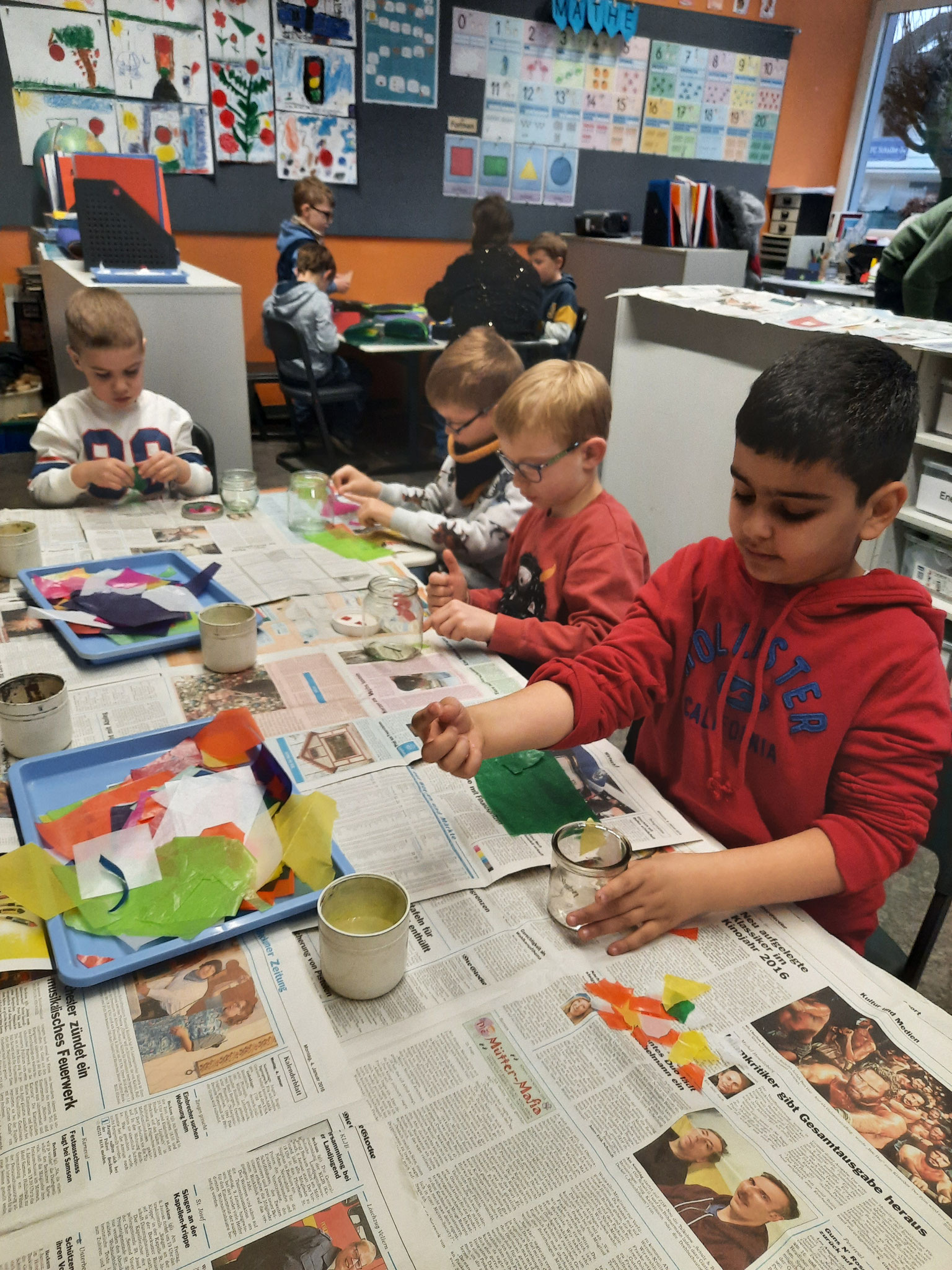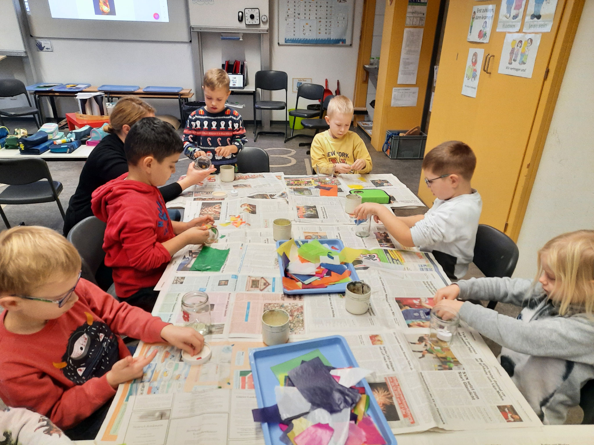 Damit wir auch in der Adventszeit genügend gemütliches Licht haben, gestaltete jeder von uns ein Kerzenglas mit Transparentpapierstücken und Kleister. Wir freuen uns schon darauf, wenn wir die Gläser am Montag erstrahlen lassen können.