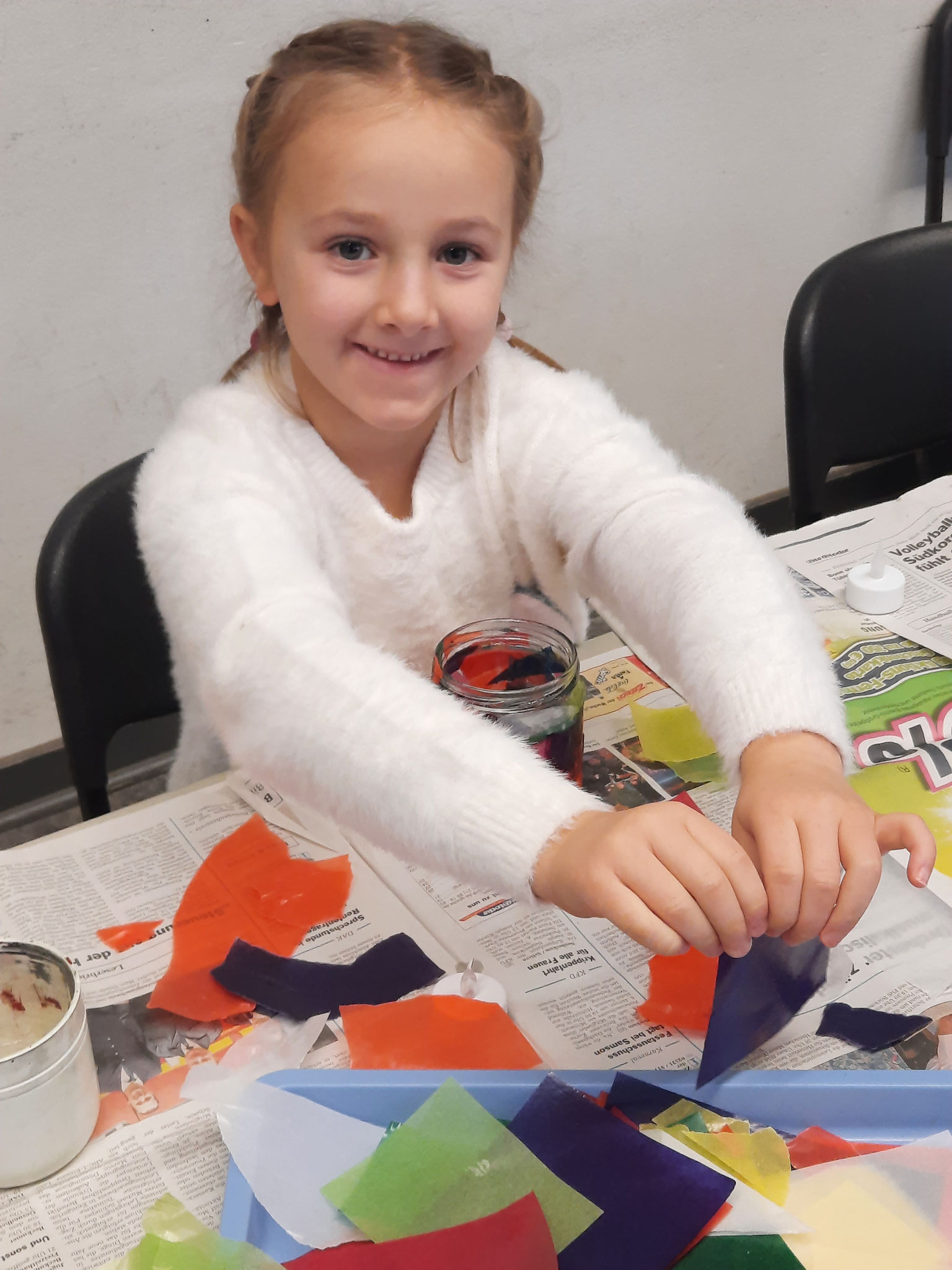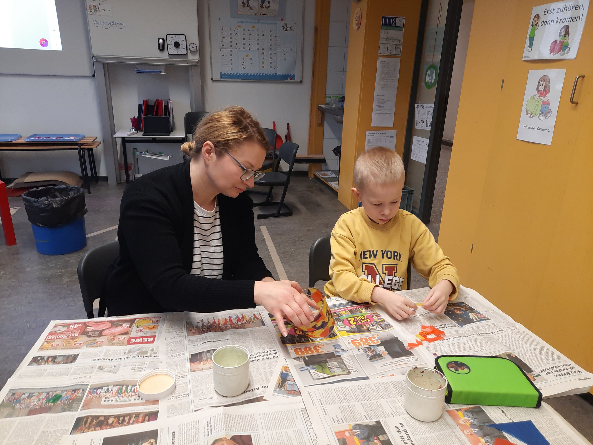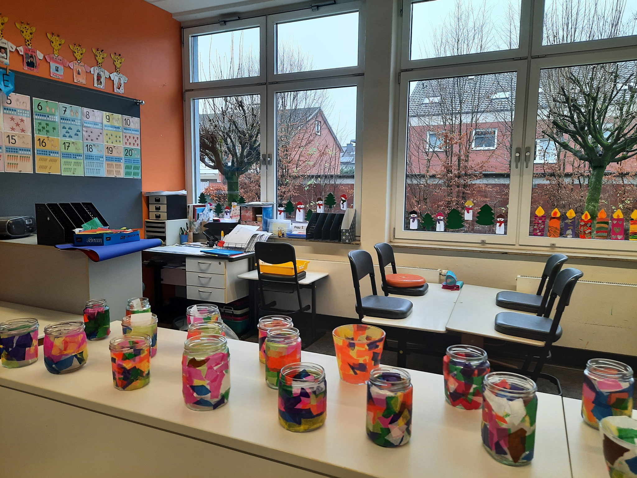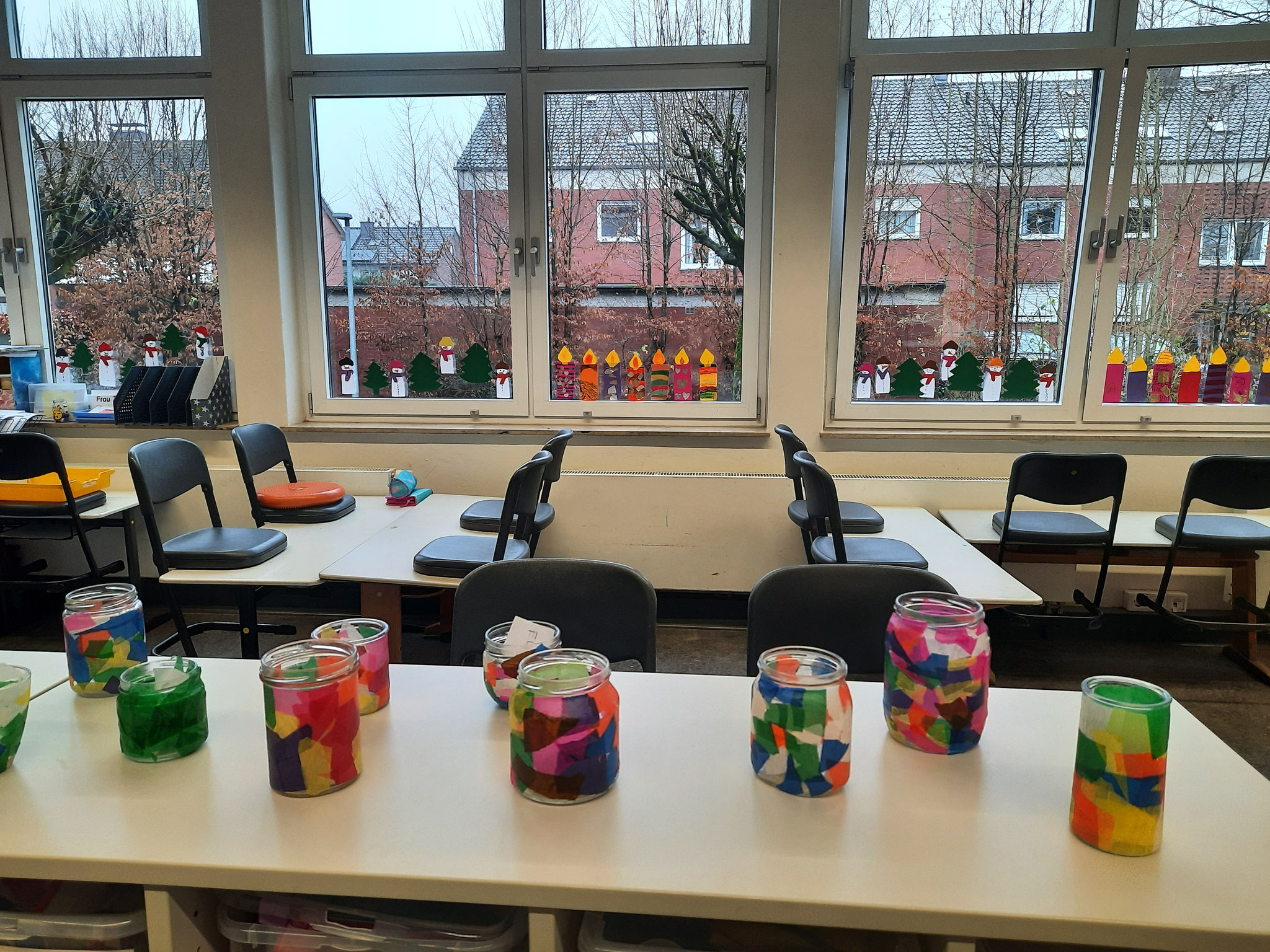 Damit wir auch in der Adventszeit genügend gemütliches Licht haben, gestaltete jeder von uns ein Kerzenglas mit Transparentpapierstücken und Kleister. Wir freuen uns schon darauf, wenn wir die Gläser am Montag erstrahlen lassen können.