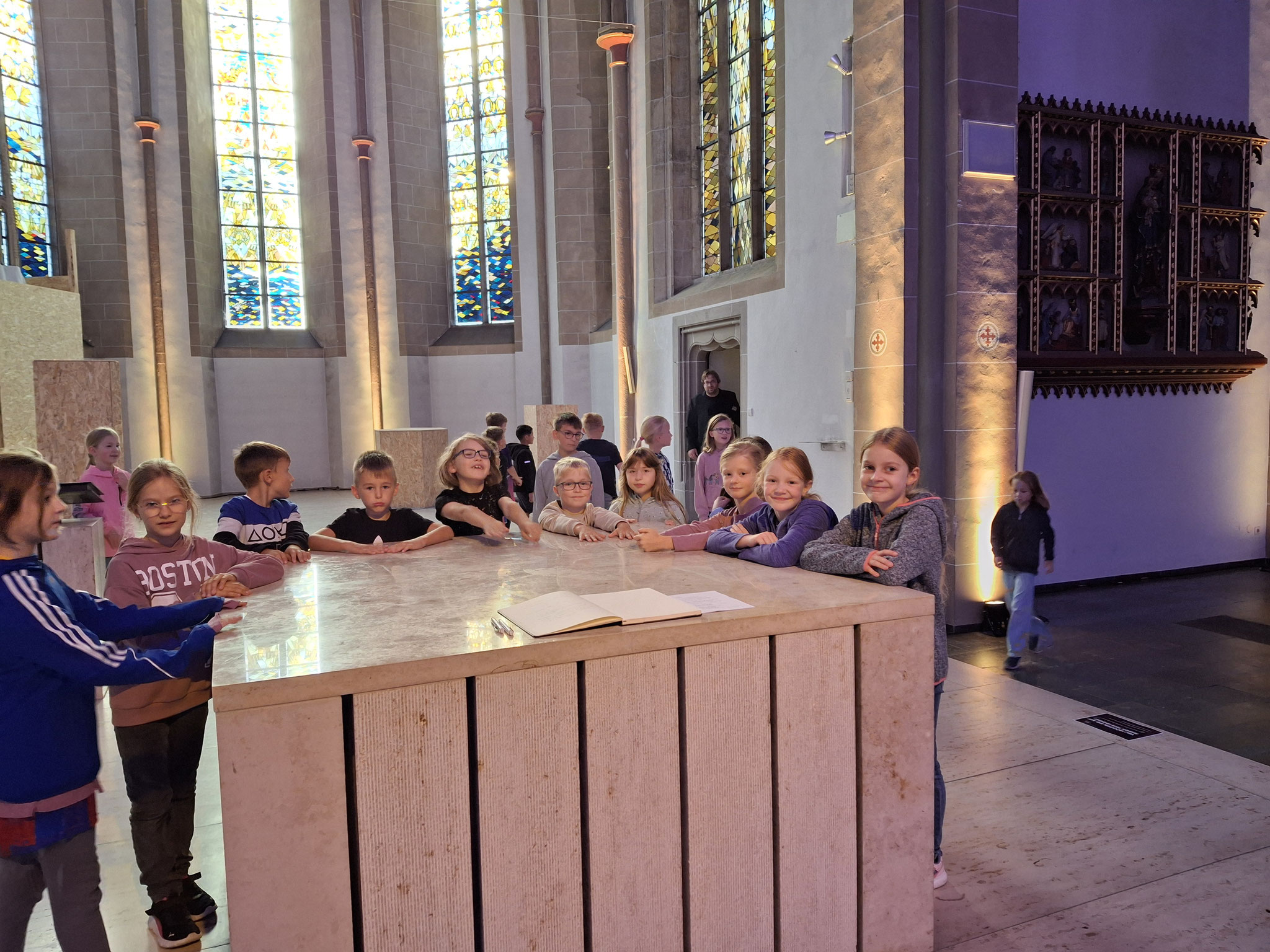 Zum Schluss haben wir uns noch alle um den Altar versammelt, ein Gebet in das Buch geschrieben und unser Lied „Gib uns Ohren, die hören“ gesungen. Das Lied singen wir immer zu Beginn des Religionsunterrichts, aber in der leeren Kirche hörte es sich noch viel besser an und hallte viel länger nach als in unserem Klassenraum.