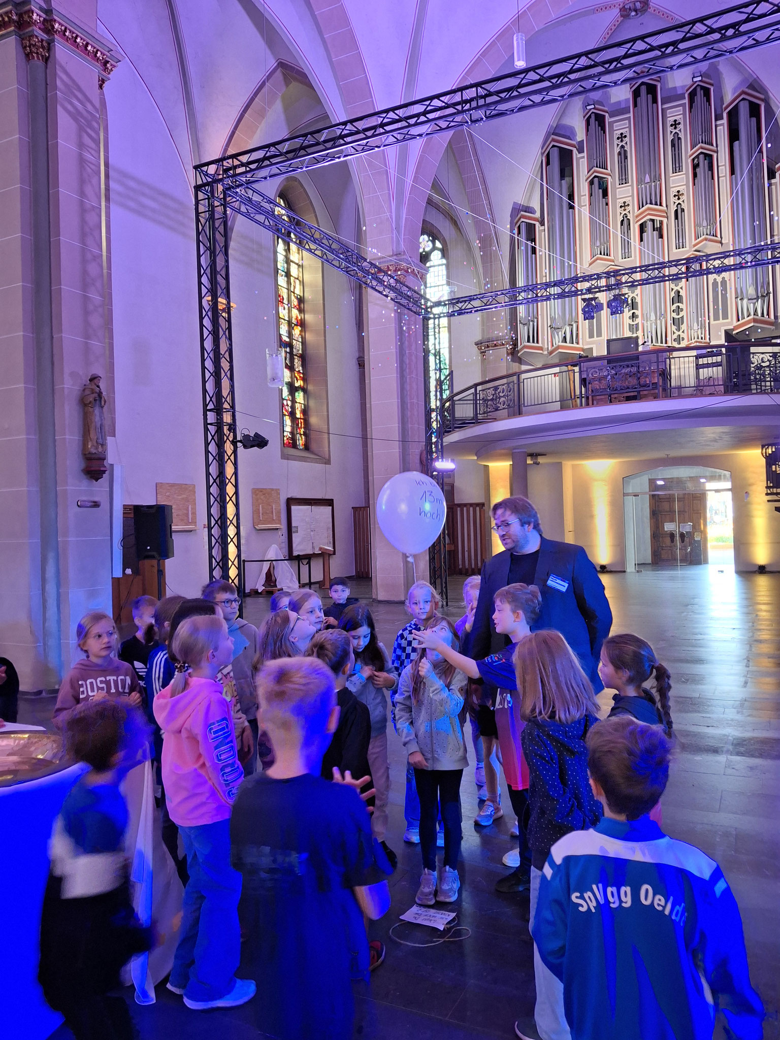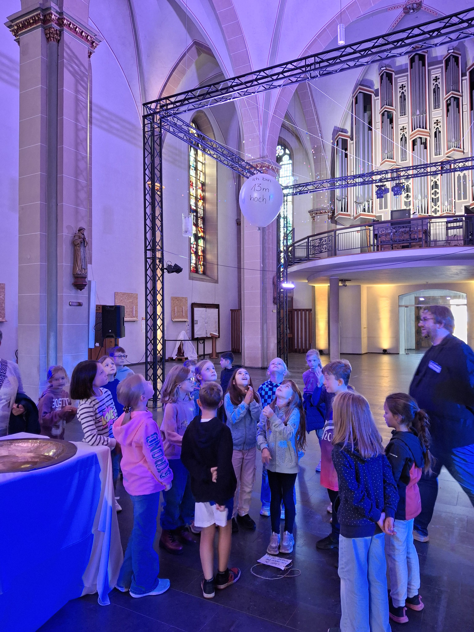 Einige von uns hatten natürlich längst den Luftballon an der Kirchendecke entdeckt, obwohl der von unten winzig klein aussah. Bevor wir ihn mit dem Band hinunterziehen durften, haben wir erst mal geschätzt, in welcher Höhe er wohl hängt. Wir wissen das jetzt, wenn ihr das wissen wollt, müsst ihr entweder selber noch die Kirche besuchen oder uns fragen!