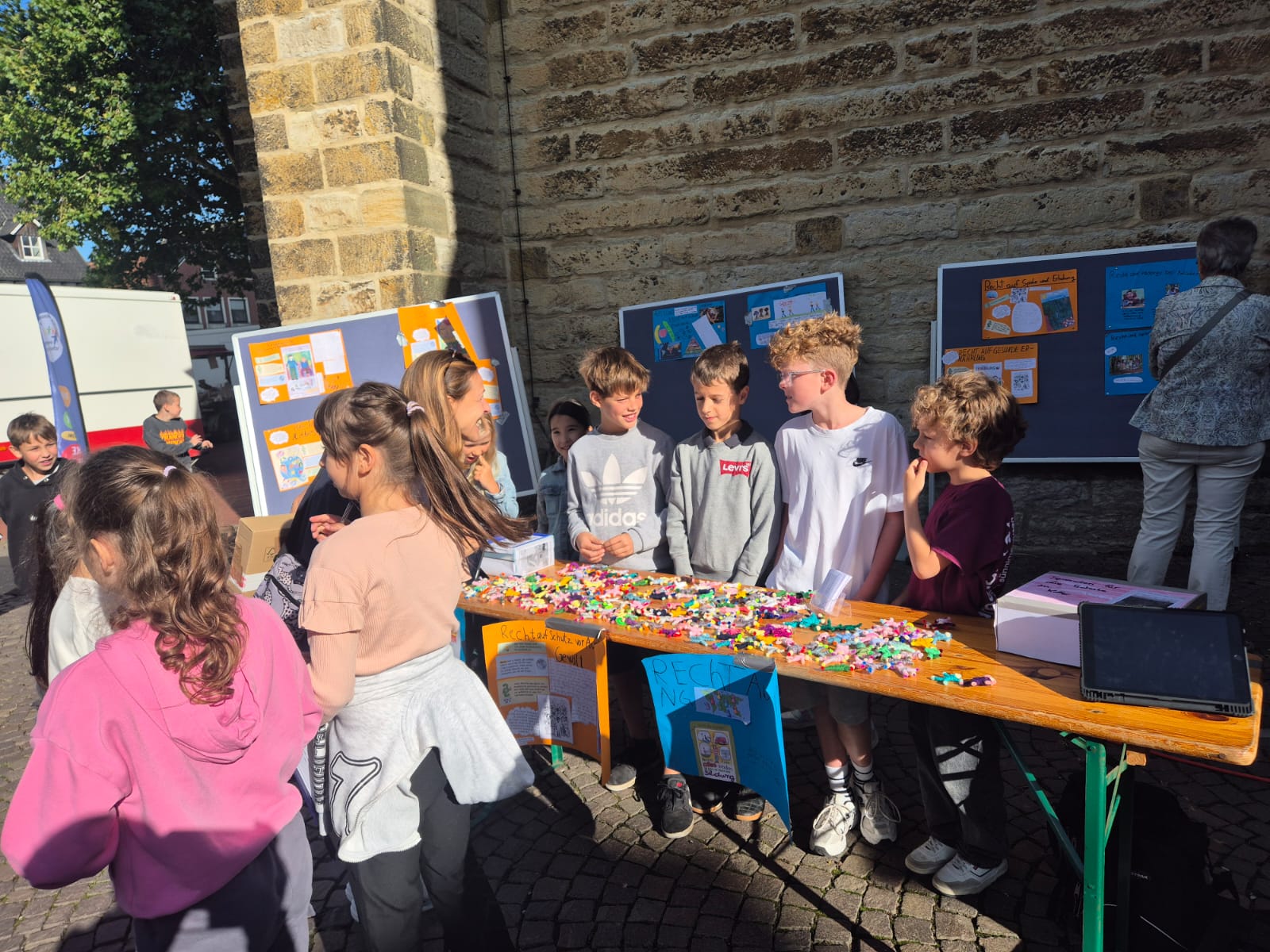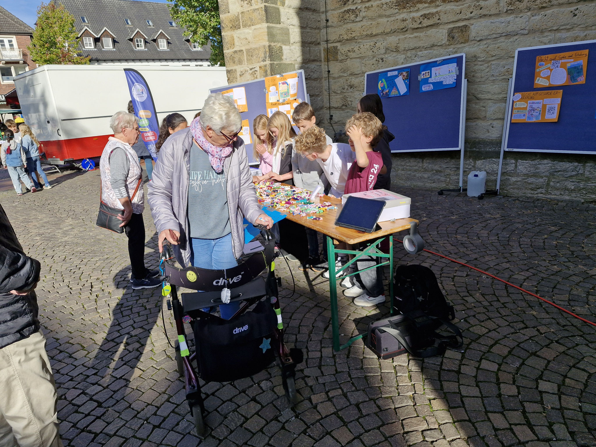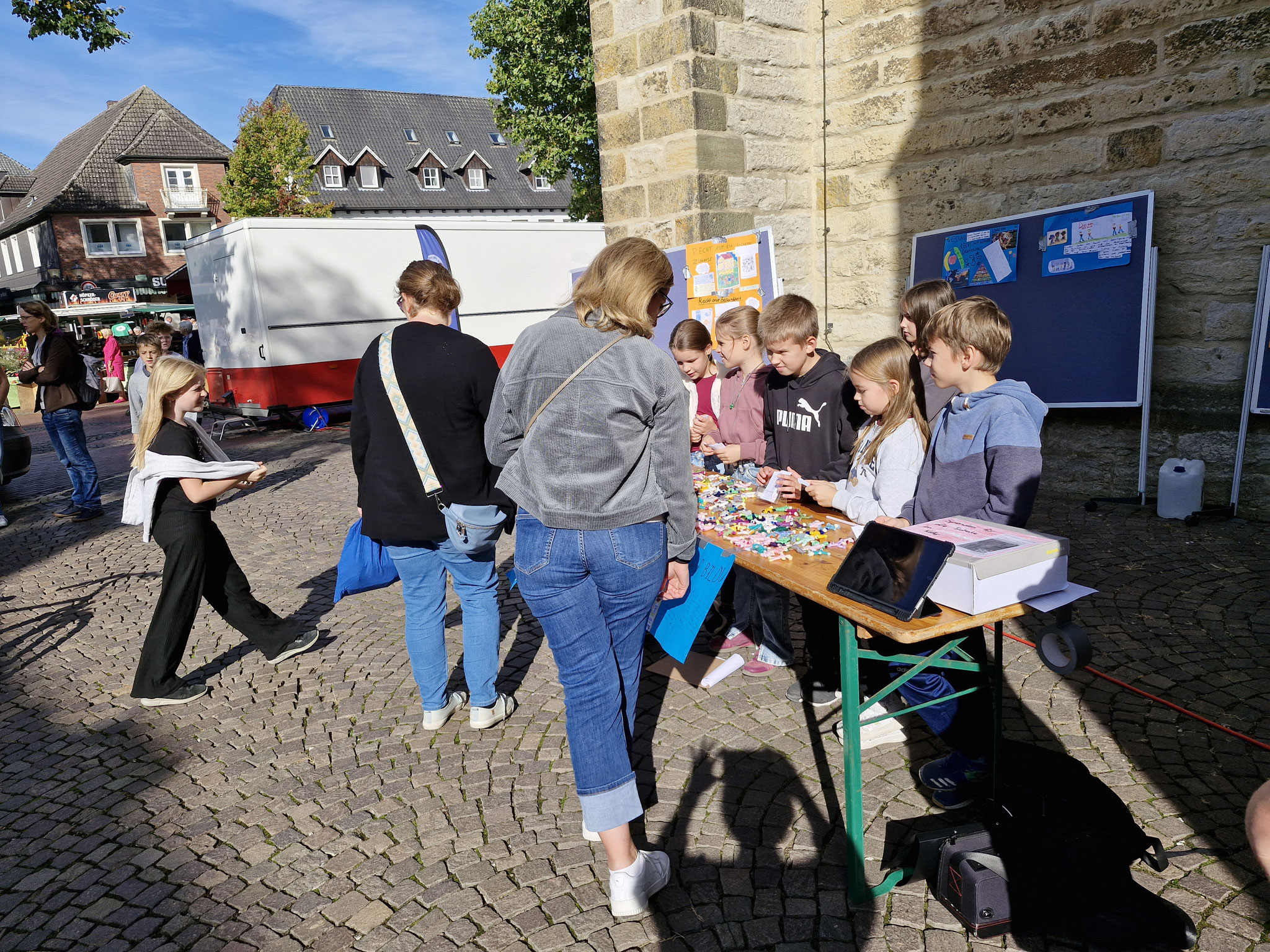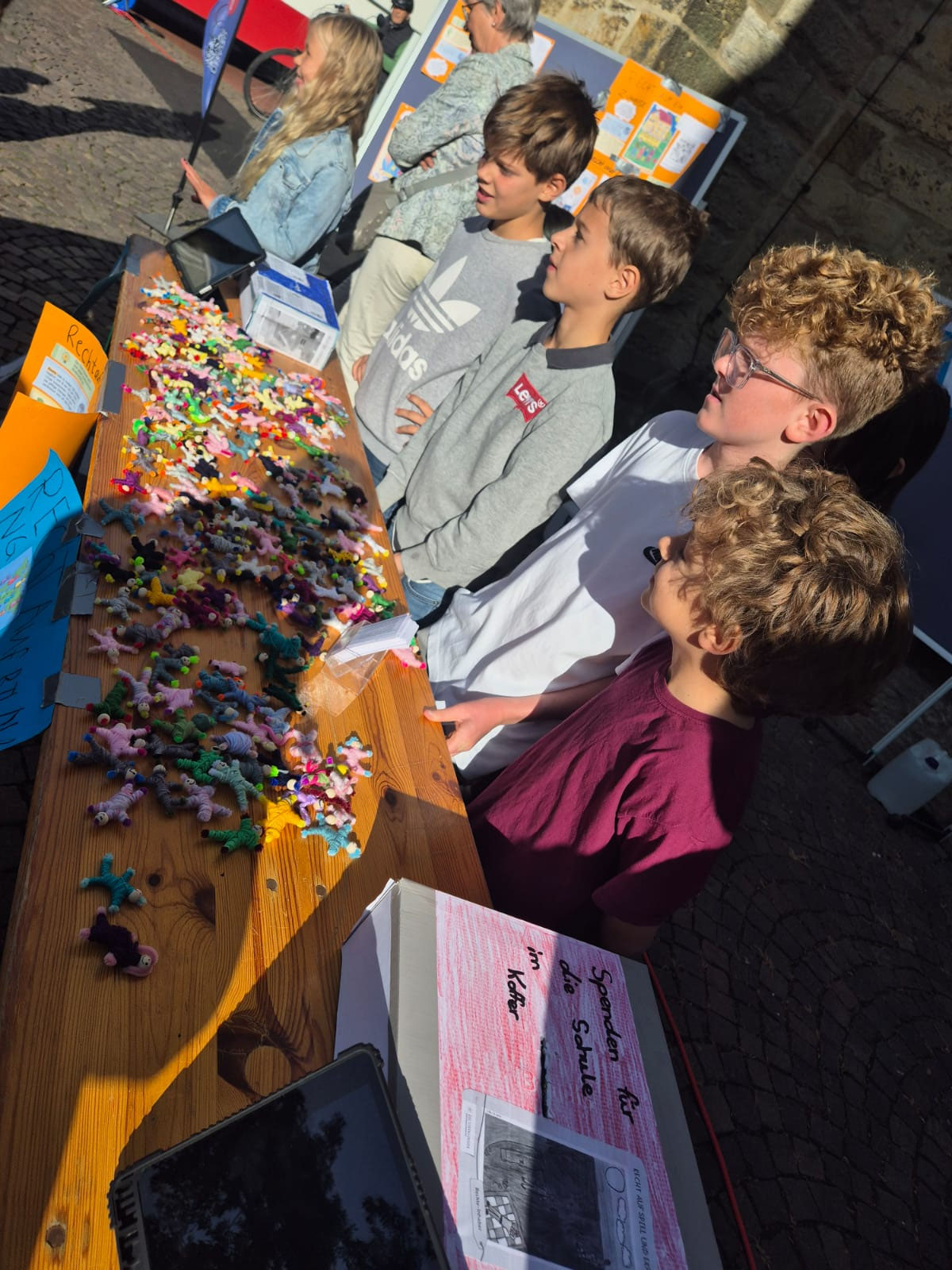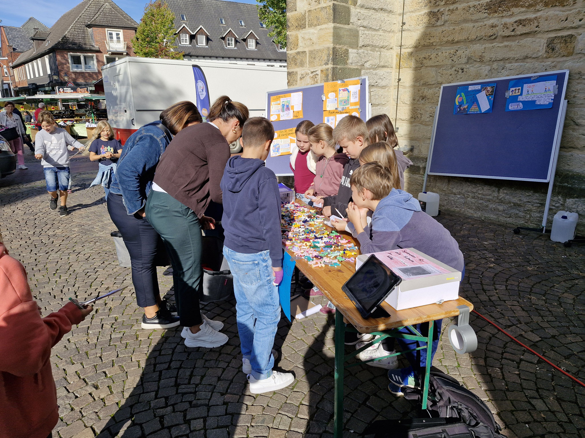 Freitag, 19.0925: Im Sachunterricht haben wir uns lange mit dem Thema Kinderrechte beschäftigt. Welche Kinderrechte gibt es? Was bedeuten sie? Nach eingängiger Recherche haben wir in Gruppen zu einem Kinderrecht Plakate erstellt. Doch wir wollten unser Wissen gerne auch nach außen tragen und mal ermitteln, ob auch Erwachsene etwas über Kinderrechte wissen. Und so haben wir am vergangenen Freitag gemeinsam mit der 4a einen Stand auf dem Oelder Marktplatz aufgebaut, unsere Plakate ausgestellt und Besucher des Marktes interviewt. An unserem Stand haben wir unsere selbstgebastelten Sorgenpüppchen gegen eine Spende verteilt. Bei strahlendem Sonnenschein war es eine ganz tolle Aktion und hat allen viel Spaß gemacht. Die gesammelten Spenden kommen dem Projekt "Schule im Koffer" von Unicef zugute.