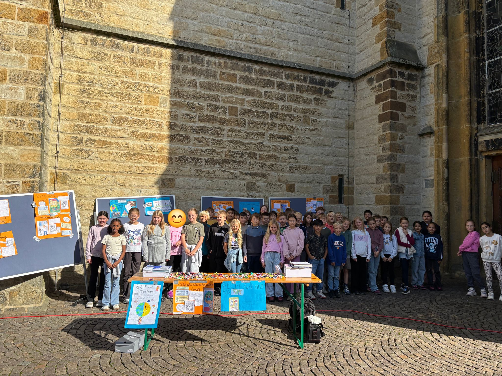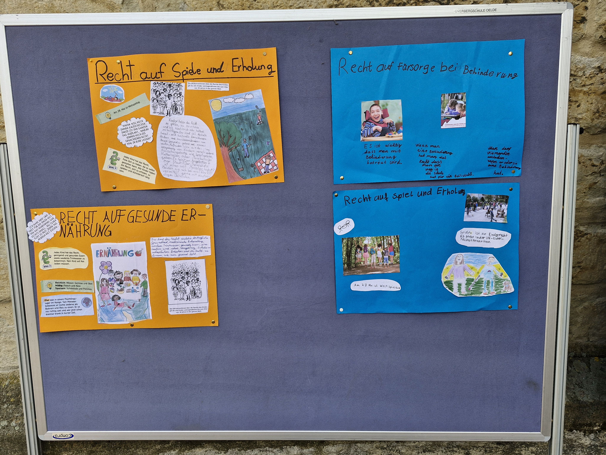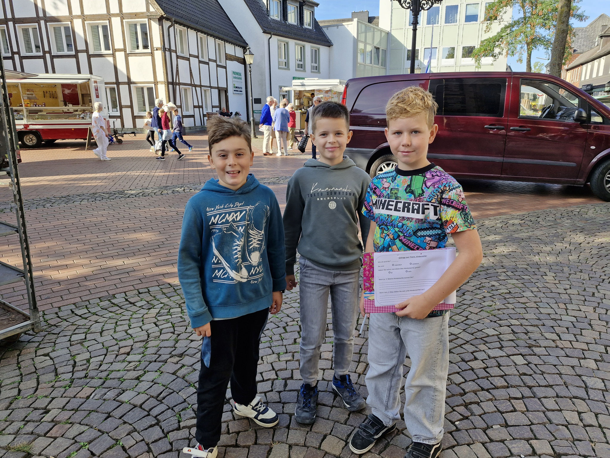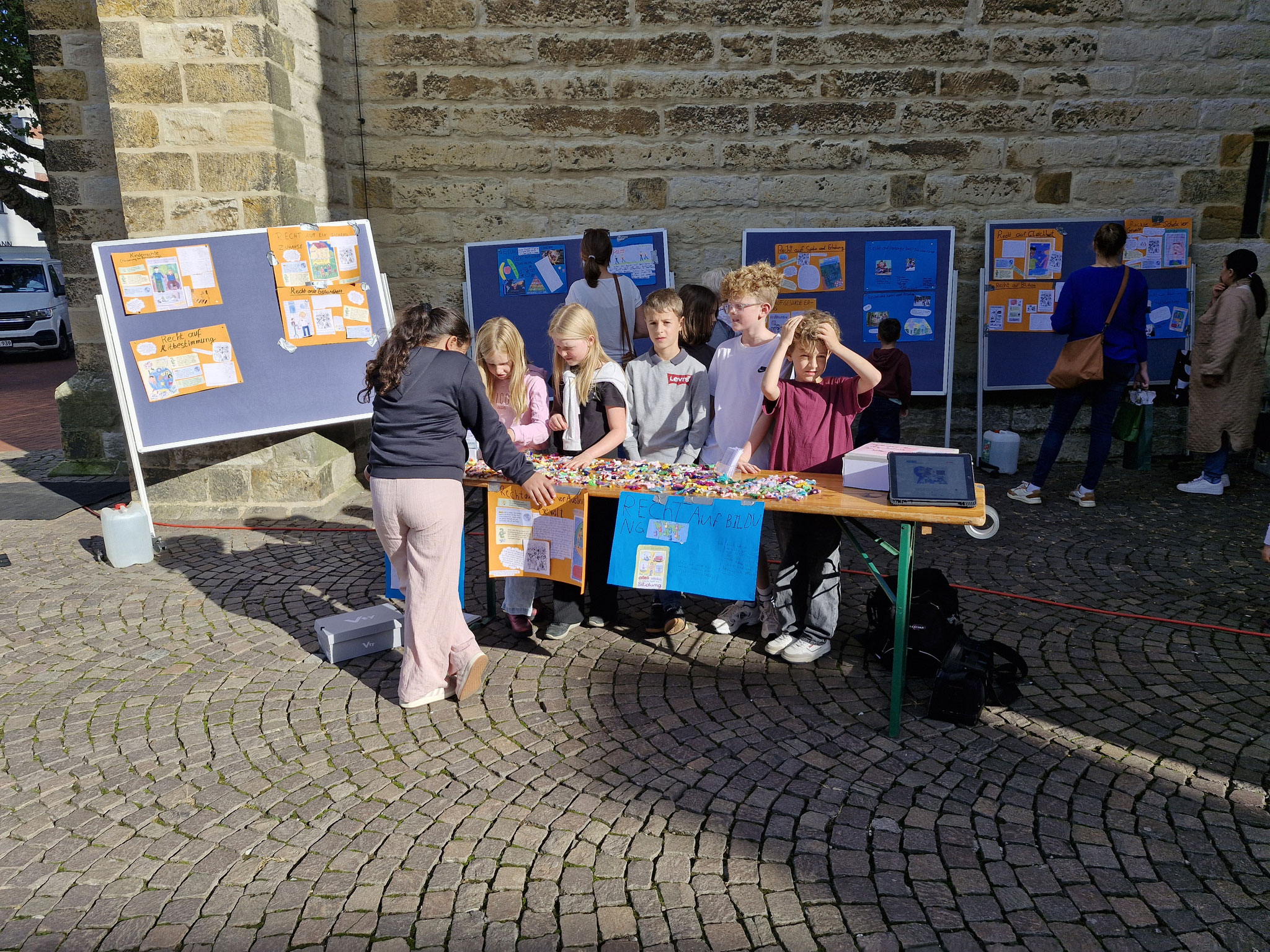 Freitag, 19.0925: Im Sachunterricht haben wir uns lange mit dem Thema Kinderrechte beschäftigt. Welche Kinderrechte gibt es? Was bedeuten sie? Nach eingängiger Recherche haben wir in Gruppen zu einem Kinderrecht Plakate erstellt. Doch wir wollten unser Wissen gerne auch nach außen tragen und mal ermitteln, ob auch Erwachsene etwas über Kinderrechte wissen. Und so haben wir am vergangenen Freitag gemeinsam mit der 4a einen Stand auf dem Oelder Marktplatz aufgebaut, unsere Plakate ausgestellt und Besucher des Marktes interviewt. An unserem Stand haben wir unsere selbstgebastelten Sorgenpüppchen gegen eine Spende verteilt. Bei strahlendem Sonnenschein war es eine ganz tolle Aktion und hat allen viel Spaß gemacht. Die gesammelten Spenden kommen dem Projekt "Schule im Koffer" von Unicef zugute.