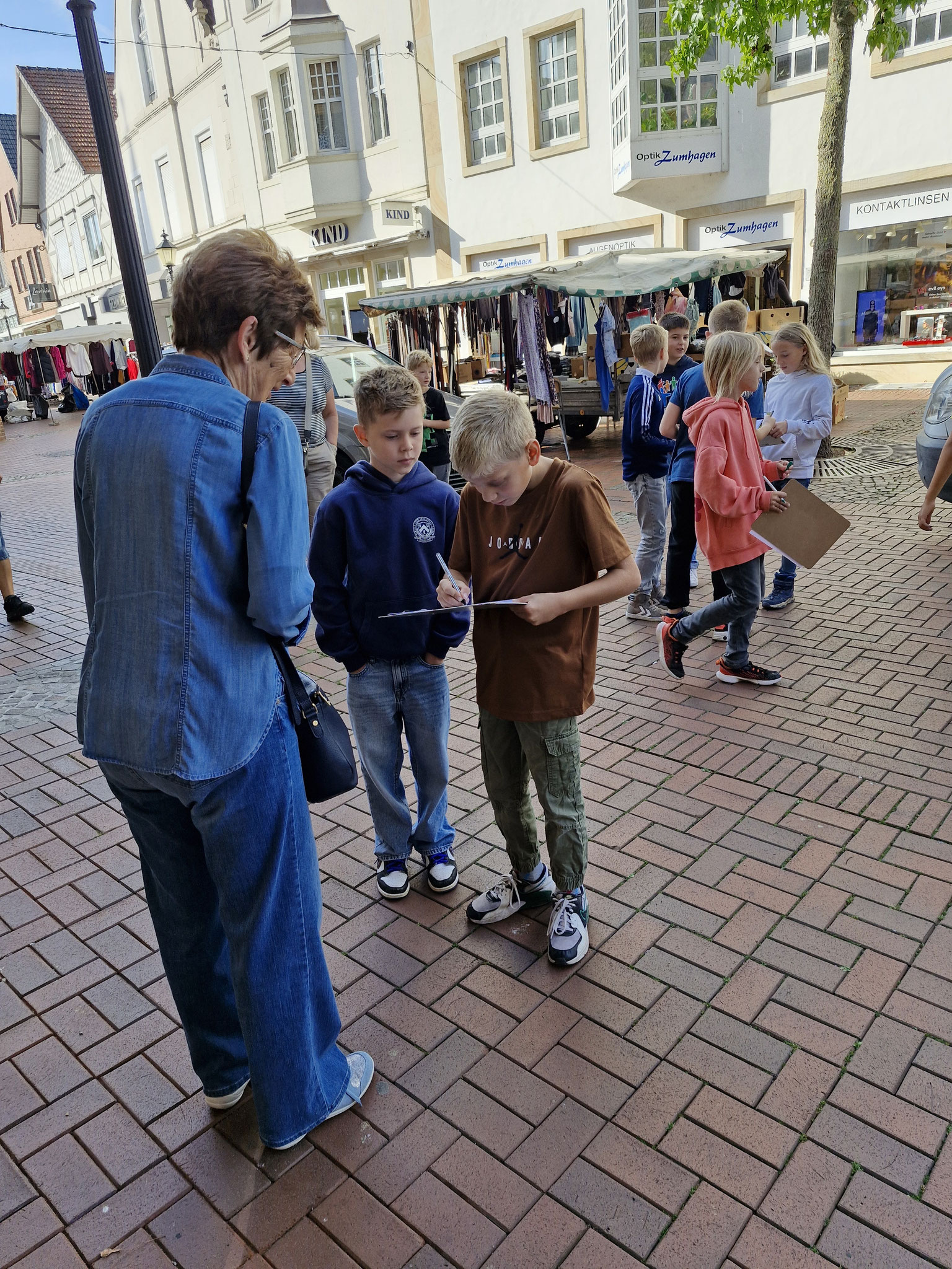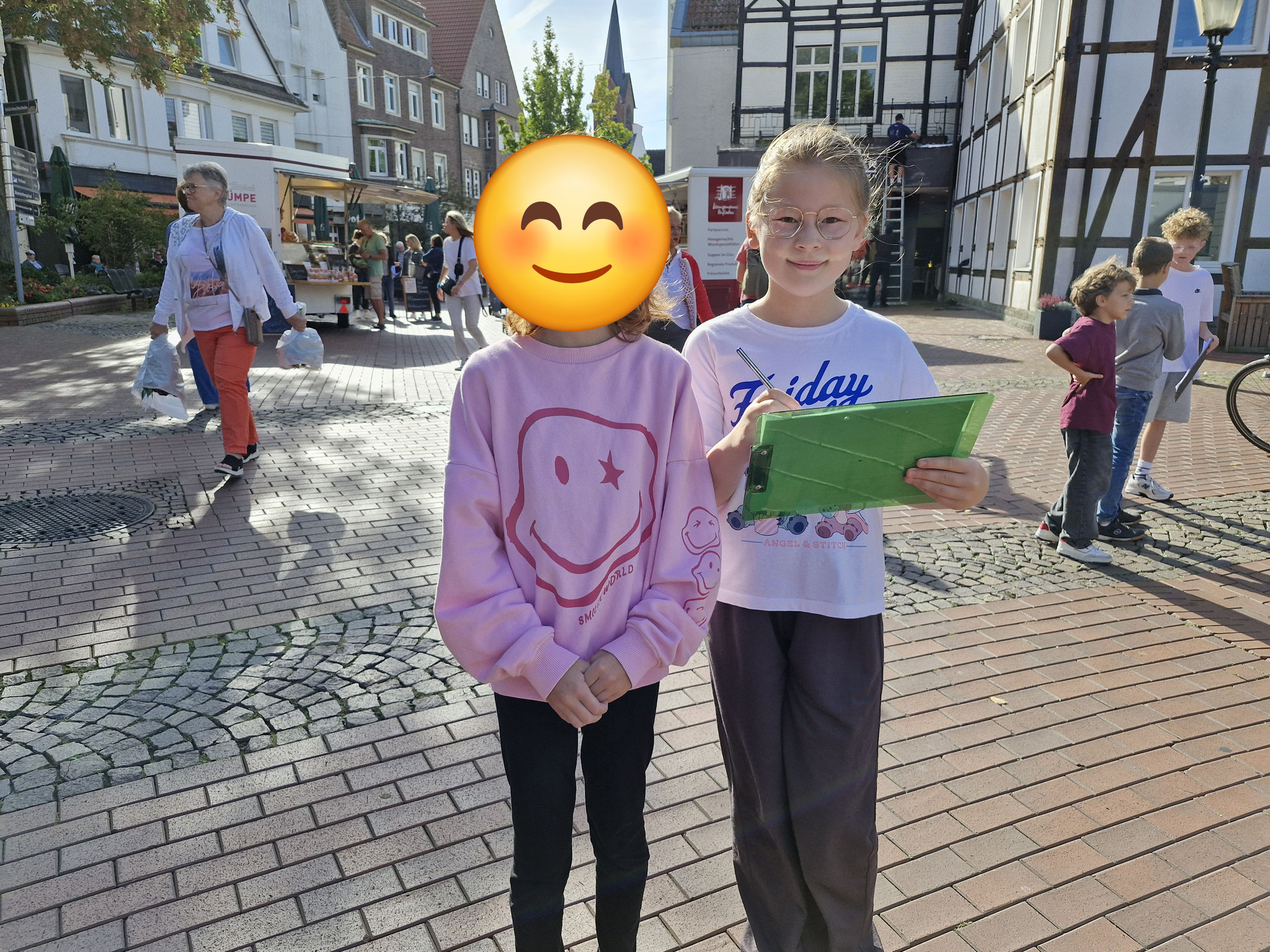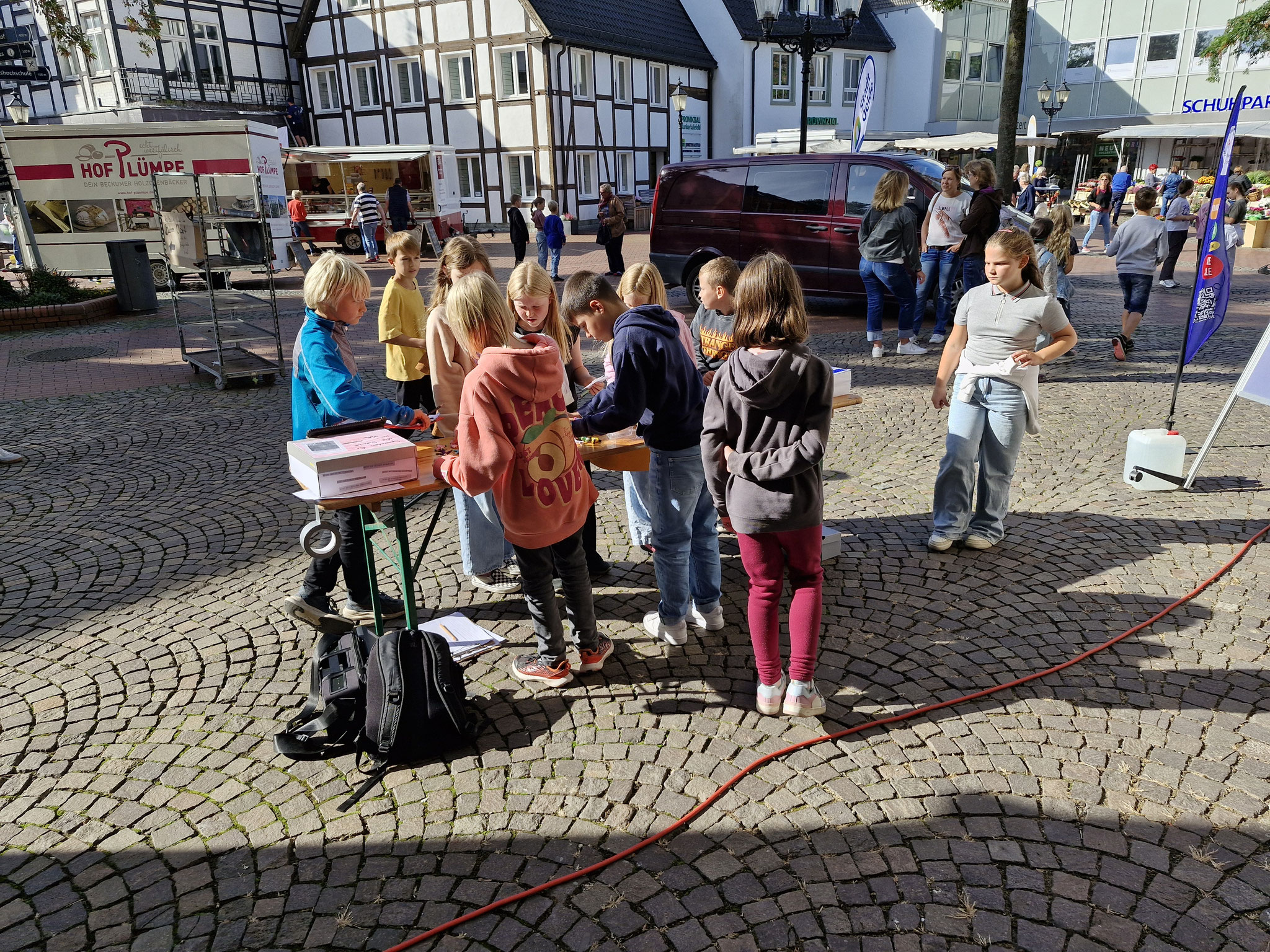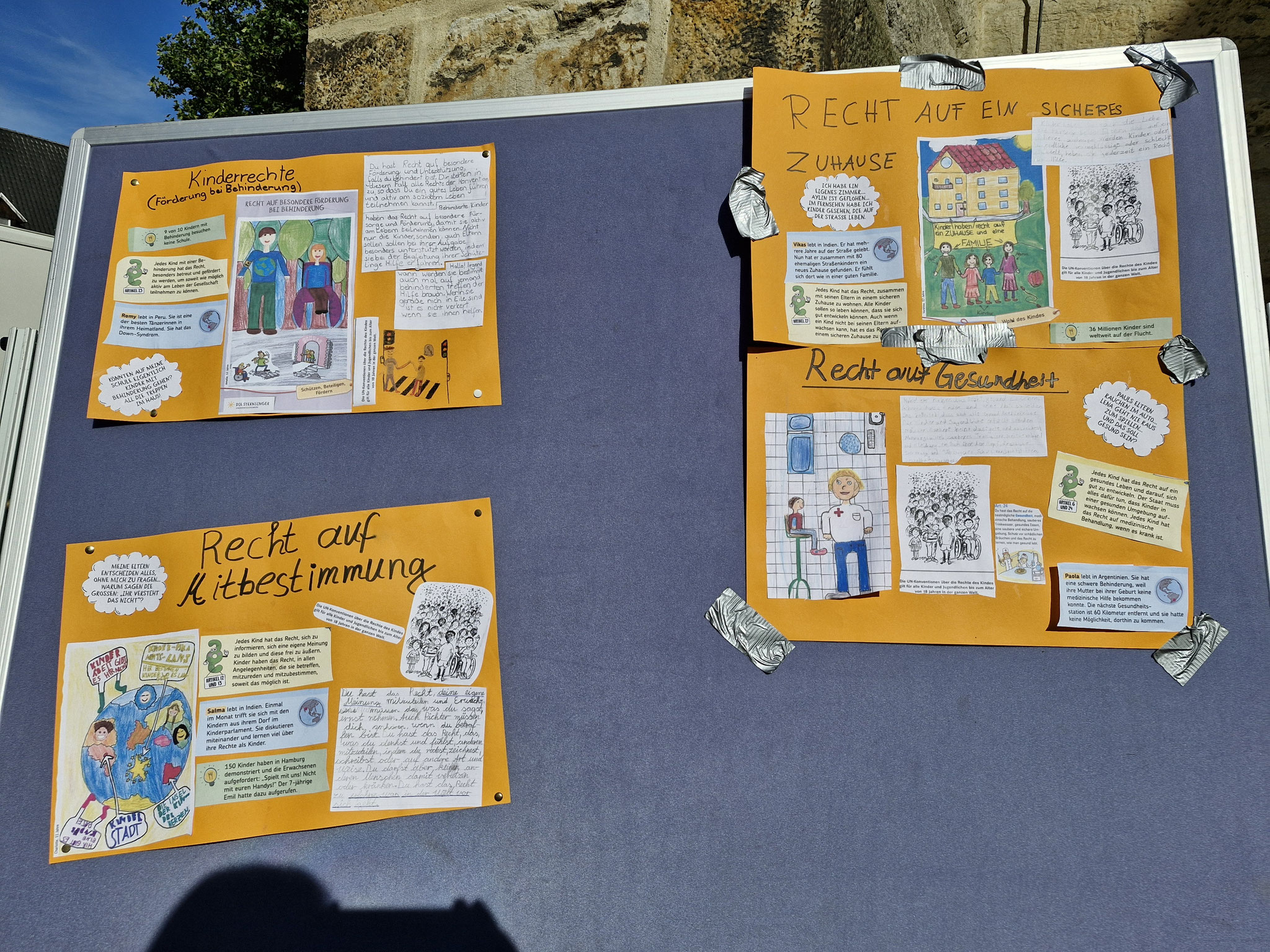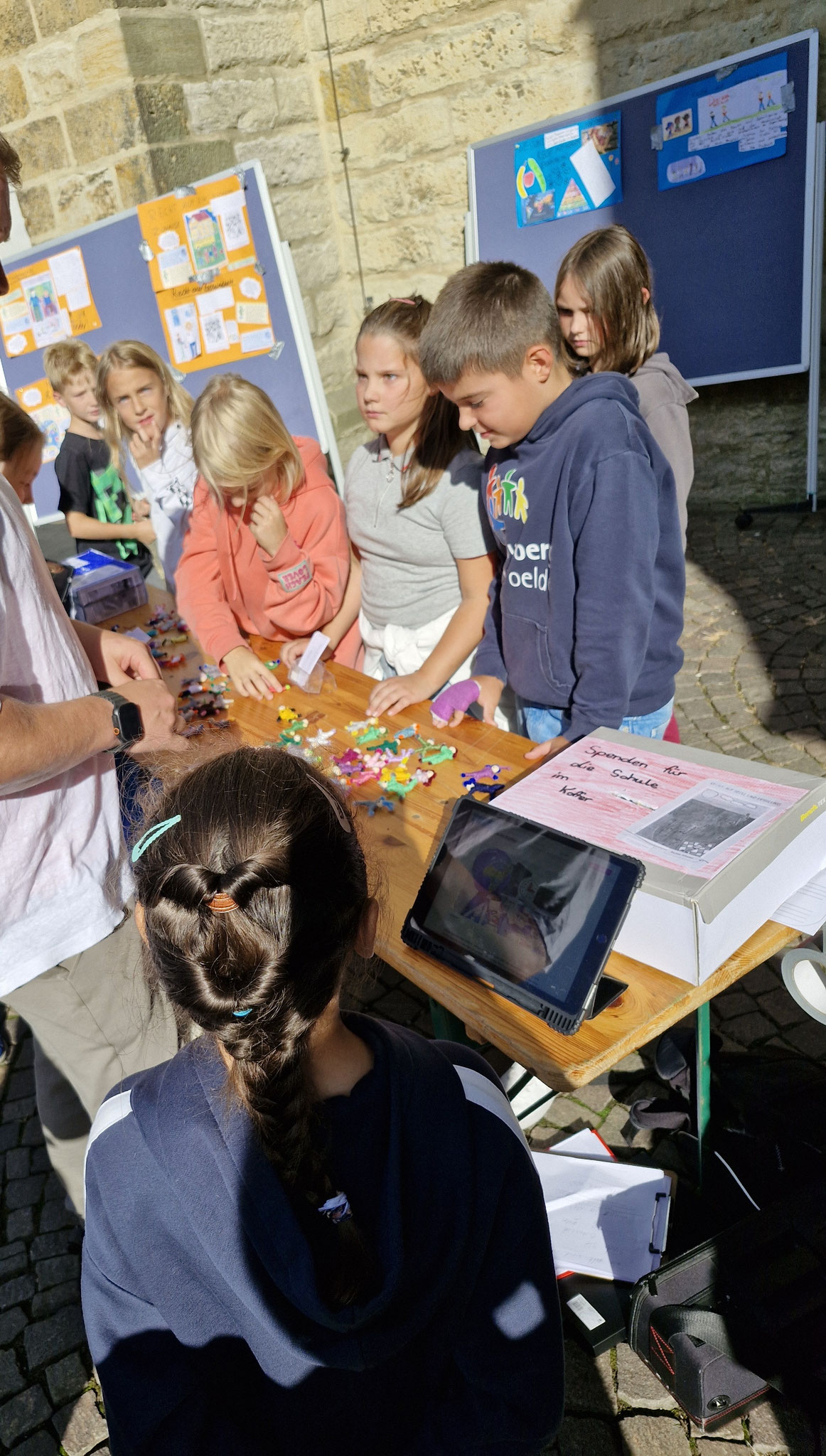 Freitag, 19.0925: Im Sachunterricht haben wir uns lange mit dem Thema Kinderrechte beschäftigt. Welche Kinderrechte gibt es? Was bedeuten sie? Nach eingängiger Recherche haben wir in Gruppen zu einem Kinderrecht Plakate erstellt. Doch wir wollten unser Wissen gerne auch nach außen tragen und mal ermitteln, ob auch Erwachsene etwas über Kinderrechte wissen. Und so haben wir am vergangenen Freitag gemeinsam mit der 4a einen Stand auf dem Oelder Marktplatz aufgebaut, unsere Plakate ausgestellt und Besucher des Marktes interviewt. An unserem Stand haben wir unsere selbstgebastelten Sorgenpüppchen gegen eine Spende verteilt. Bei strahlendem Sonnenschein war es eine ganz tolle Aktion und hat allen viel Spaß gemacht. Die gesammelten Spenden kommen dem Projekt "Schule im Koffer" von Unicef zugute.