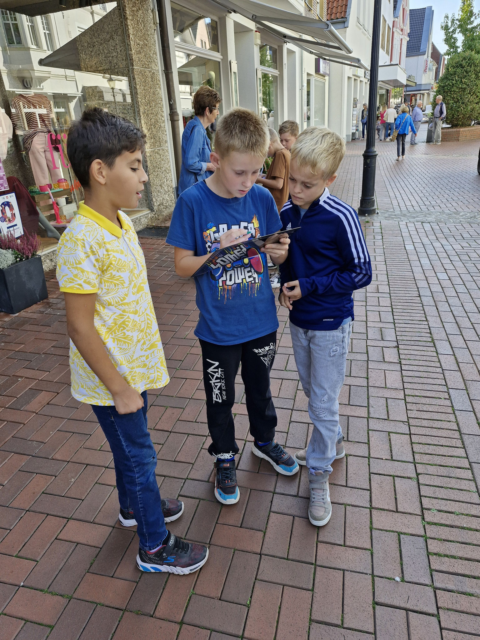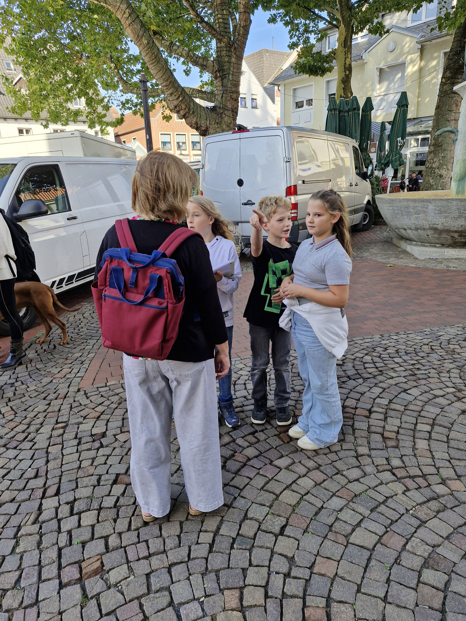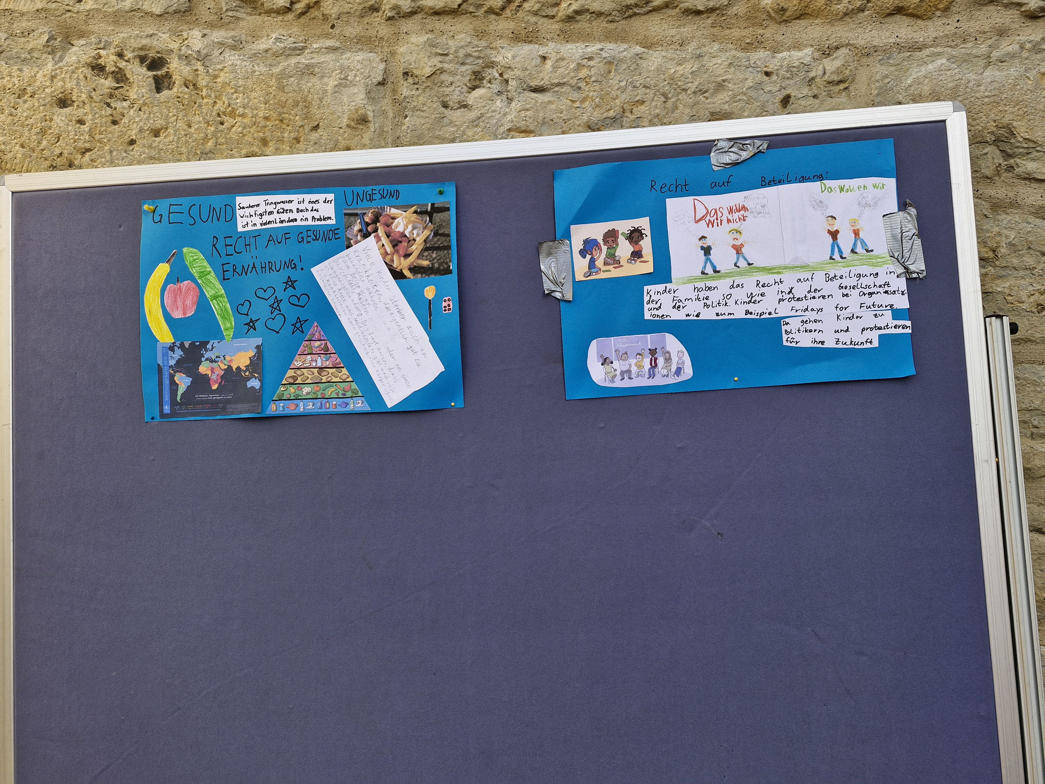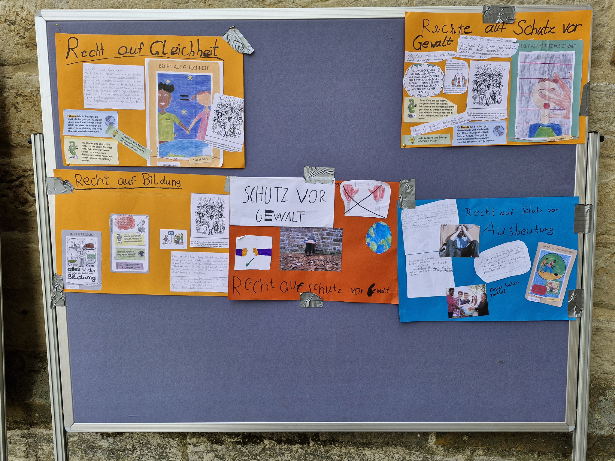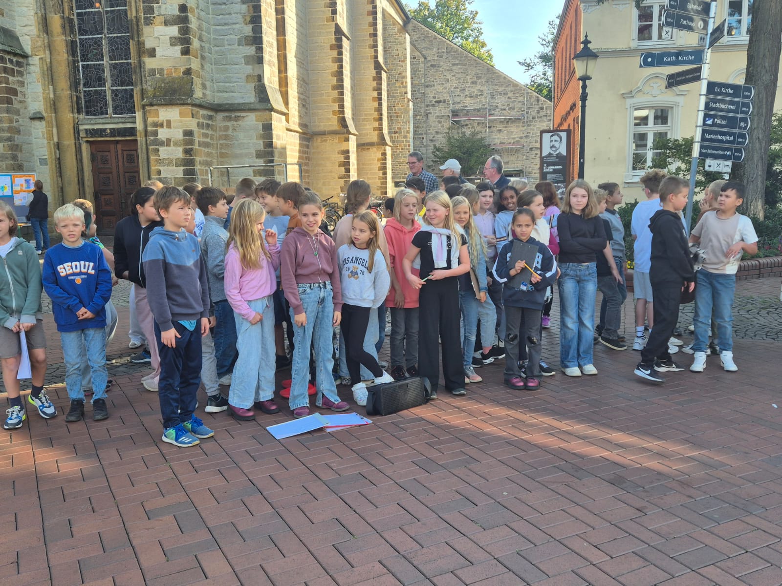 Freitag, 19.0925: Im Sachunterricht haben wir uns lange mit dem Thema Kinderrechte beschäftigt. Welche Kinderrechte gibt es? Was bedeuten sie? Nach eingängiger Recherche haben wir in Gruppen zu einem Kinderrecht Plakate erstellt. Doch wir wollten unser Wissen gerne auch nach außen tragen und mal ermitteln, ob auch Erwachsene etwas über Kinderrechte wissen. Und so haben wir am vergangenen Freitag gemeinsam mit der 4a einen Stand auf dem Oelder Marktplatz aufgebaut, unsere Plakate ausgestellt und Besucher des Marktes interviewt. An unserem Stand haben wir unsere selbstgebastelten Sorgenpüppchen gegen eine Spende verteilt. Bei strahlendem Sonnenschein war es eine ganz tolle Aktion und hat allen viel Spaß gemacht. Die gesammelten Spenden kommen dem Projekt "Schule im Koffer" von Unicef zugute.