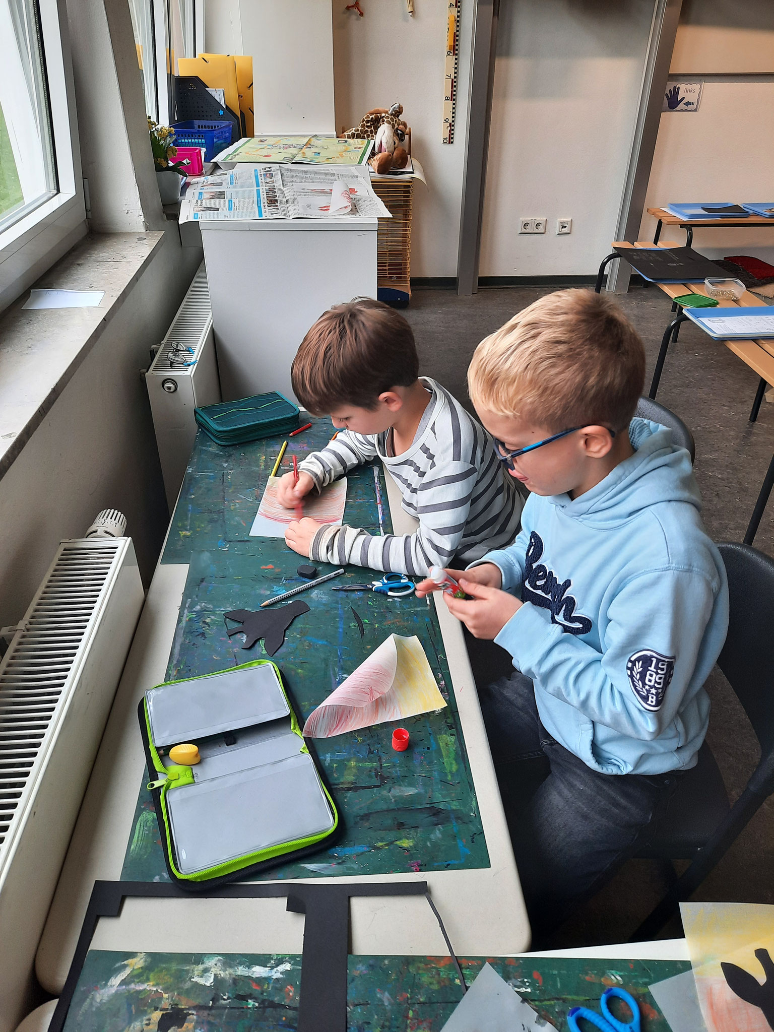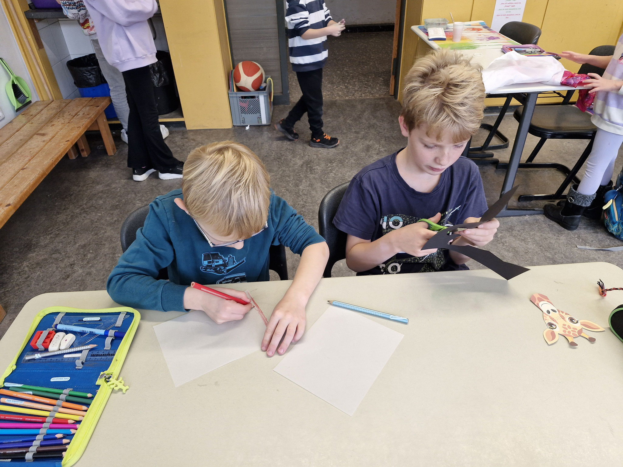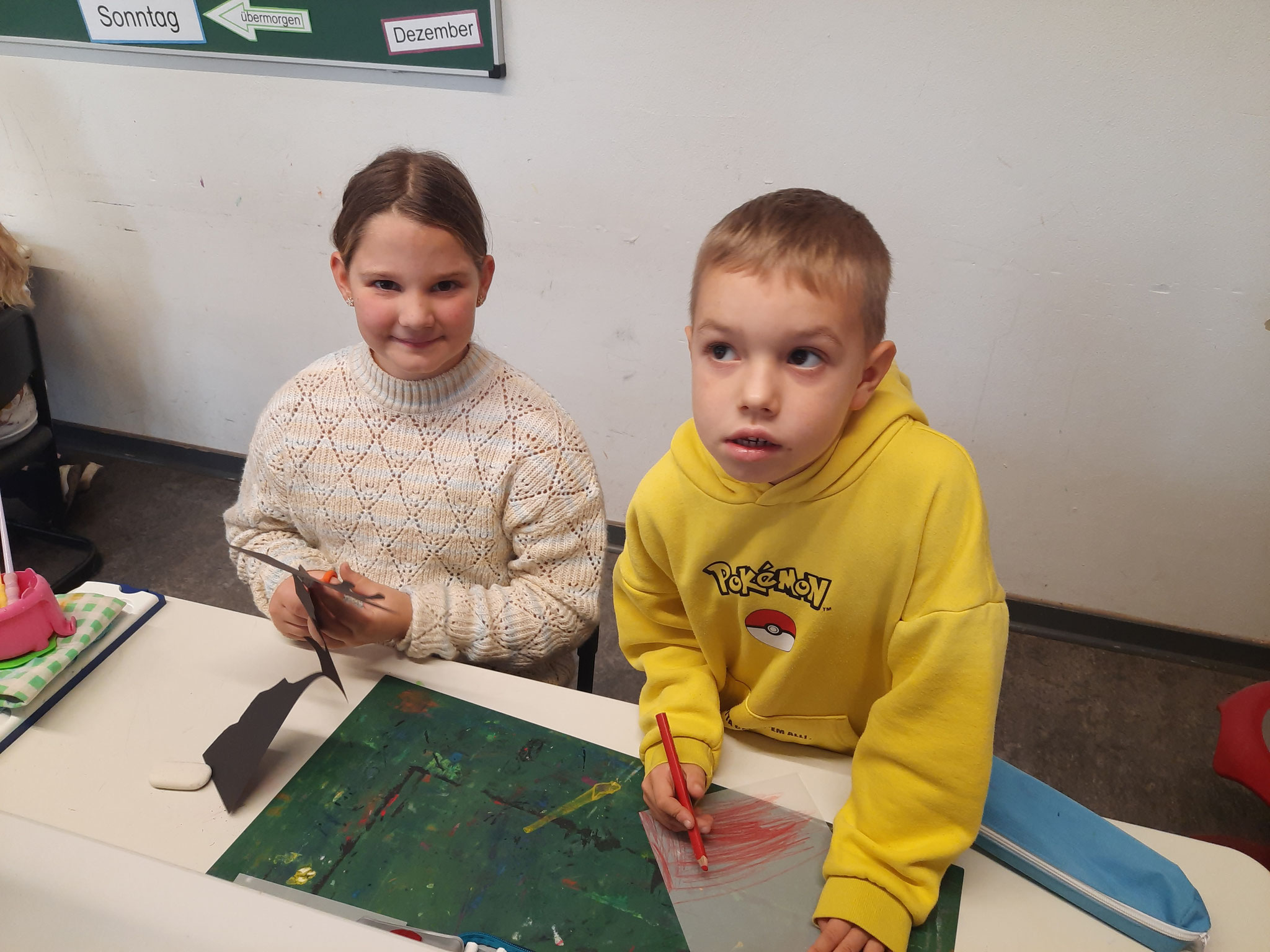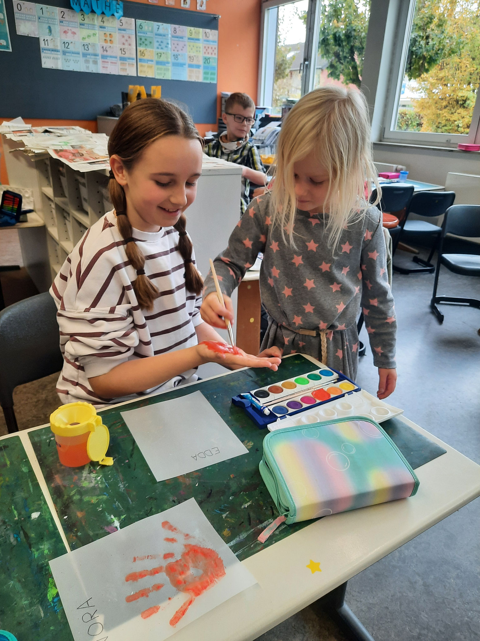 Freitag, 31.10.25: Unser Fest zu St. Martin rückt immer näher und unsere Paten möchten natürlich auch mit bunt gestalteten Laternen unseren großen Umzug mitmachen. Daher haben wir uns am vergangenen Freitag mit unserer Patenklasse getroffen und gemeinsam Laternen gebastelt. Mit unserer Hilfe haben die Erstklässler tolle Laternen mit Giraffen, bunten Farben und unseren Handabdrücken gestaltet. Jetzt kann St. Martin kommen. Es hat viel Spaß gemacht.